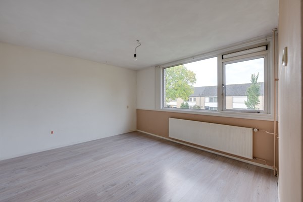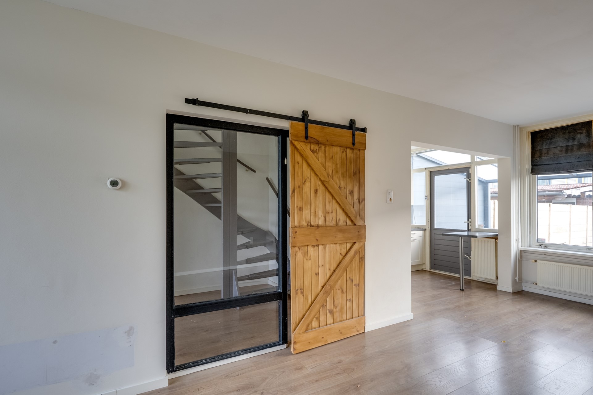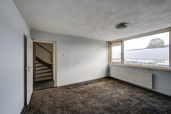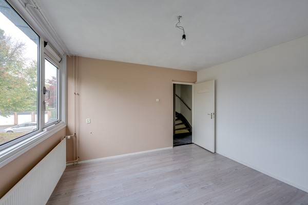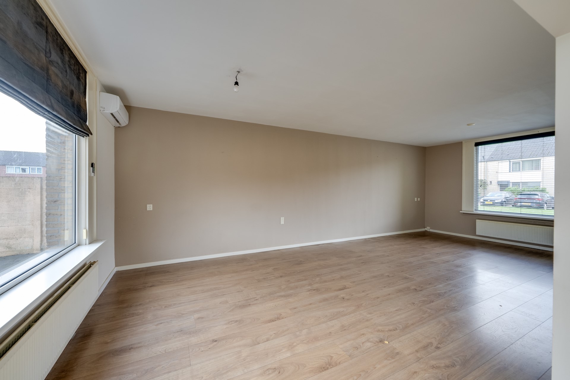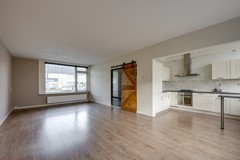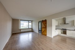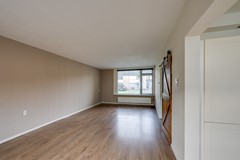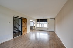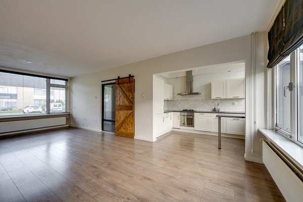 De woonkamer (8,10 m. x 4,01 m.) heeft een laminaatvloer. De wanden zijn glad afgewerkt en het plafonds is v.v. schuurwerk. De witte, aluminium kozijnen zijn v.v. HR+ glas. De ruimte is v.v. airconditioning.