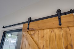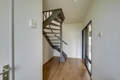 Entree/hal (4,72 m. x 2,22 m.) met garderobe, toilet met fonteintje, trapopgang, meterkast (6 groepen, 2 aardlekschakelaar en glasvezel) en ingang naar woonkamer. De hal is voorzien van een laminaatvloer. Tussen de hal en woonkamer zit een groot raam voor extra lichtinval en een houten, landelijke schuifdeur.