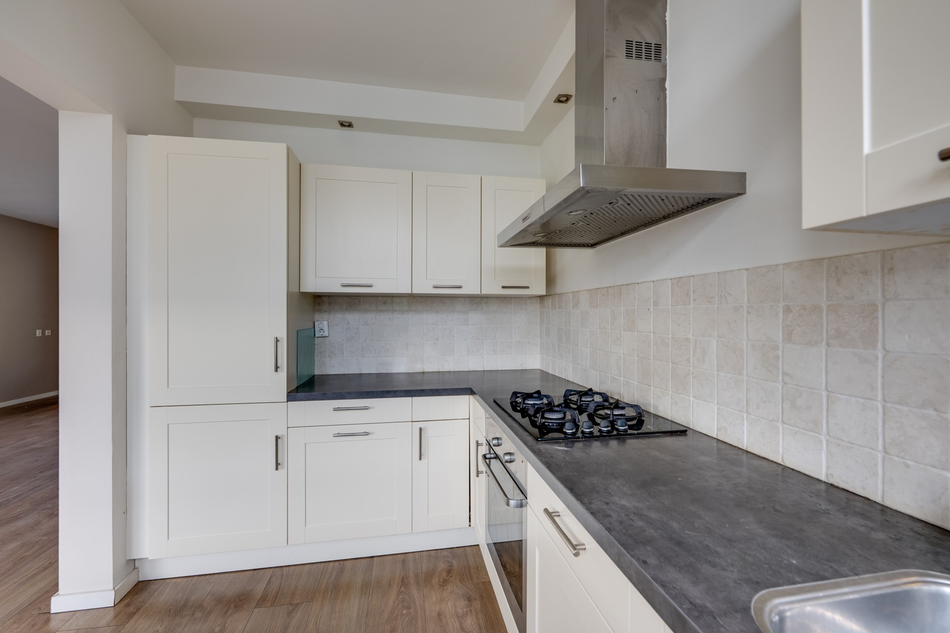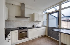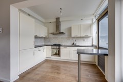 De open keuken (3,28 m. x 2,20 m.) ligt aan de achterzijde van de woning. Er staat een keukenblok in hoekopstelling met voldoende kastruimte in onder- en bovenkasten. De keuken is voorzien van een 4-pits gaskookplaat, een oven, een RVS afzuigkap, een vaatwasser en een koel-/vriescombinatie. De laminaatvloer is doorgetrokken vanuit de woonkamer. Het hardhouten kozijn met loopdeur geeft u toegang tot de achtertuin.