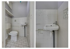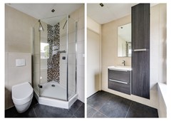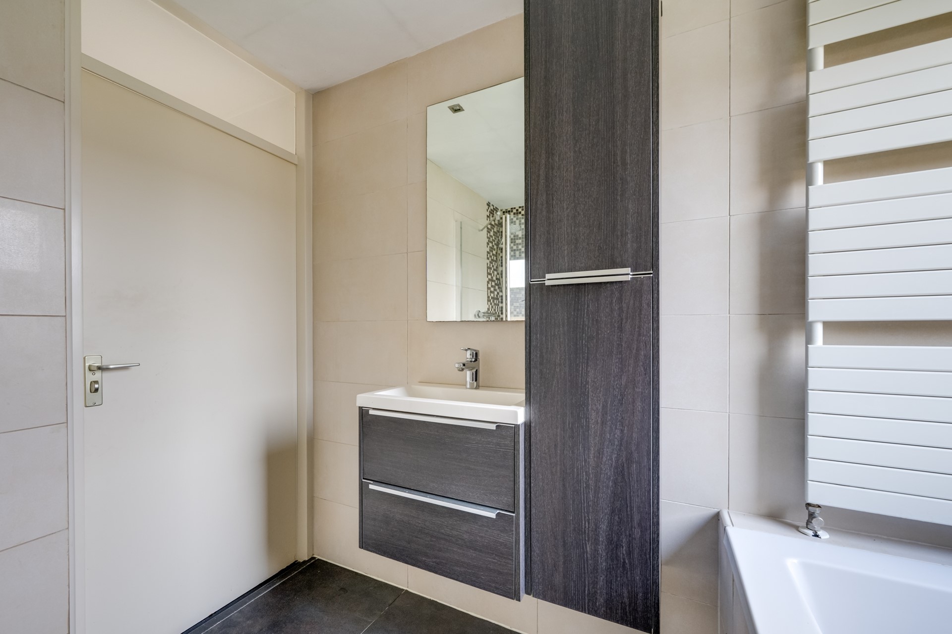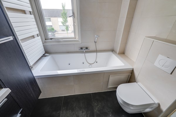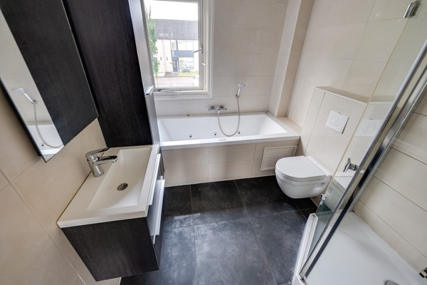 De geheel betegelde badkamer (2,55 m. x 2,20 m.) ligt aan de voorzijde en is v.v. een ligbad en een douchecabine, beiden v.v. een thermostaatkraan. Verder is er een hangend toilet en een wastafelmeubel met twee lades en een zwevende kast.