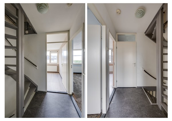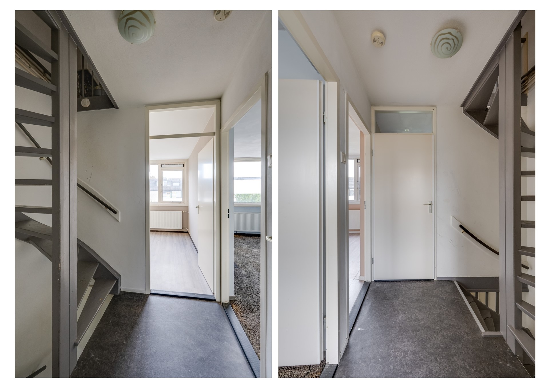 Overloop met toegang tot 3 ruime slaapkamers, de badkamer en de vaste trap naar de tweede verdieping. Alle aluminium kozijnen op deze verdieping zijn voorzien van dubbel glas.