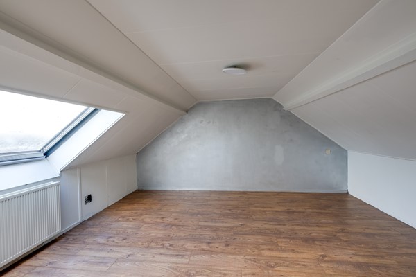 Deze slaapkamer (5,00/3,74 m. x 4,03 m.) heeft een laminaatvloer en het plafond is afgewerkt met stucplaten. Aan de achterzijde vindt u een groot Velux dakraam v.v. dubbel glas.
