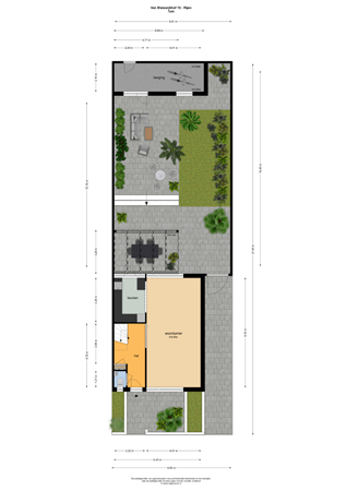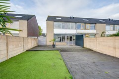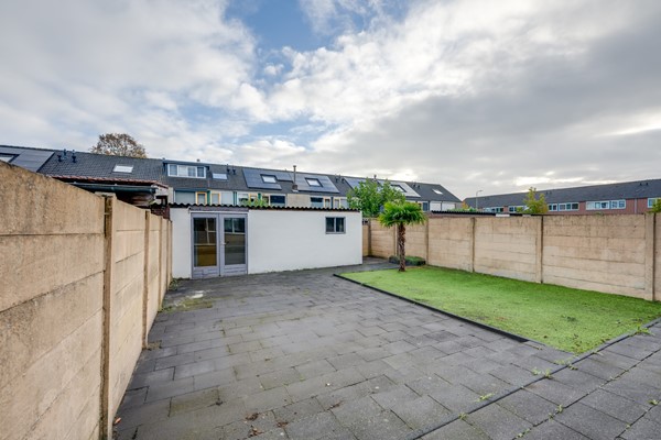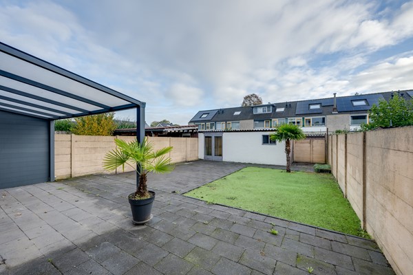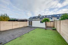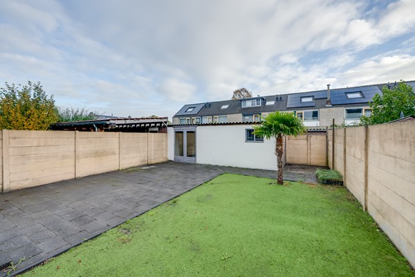De achtertuin (ca. 14,40 m. x 8,61 m.) is gelegen op het zuidoosten. Direct achter de woning staat een antraciet, aluminium terrasoverkapping met transparant, polycarbonaat dak, zodat u de lichtinval in uw woonkamer behoud. De tuin is v.v. tegels, een kunststof gazon en een buitenkraan. Achter in de tuin staat een berging (6,65 m. x 2,10 m.) v.v. elektra en een poort voor achterom. Aan de voorzijde, naast de woning, vindt u een extra brede poort.