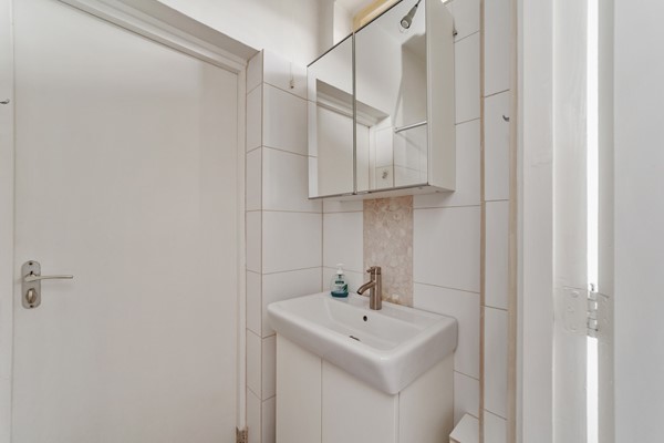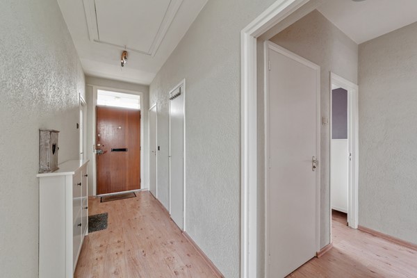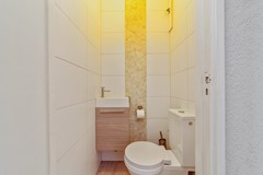 Entree woning: L-vormige hal v.v. doorgelegde (akoestisch) laminaatvloer, meterkast, vaste kast, neutraal betegelde toiletruimte met fontein en toegang tot de overige vertrekken.
