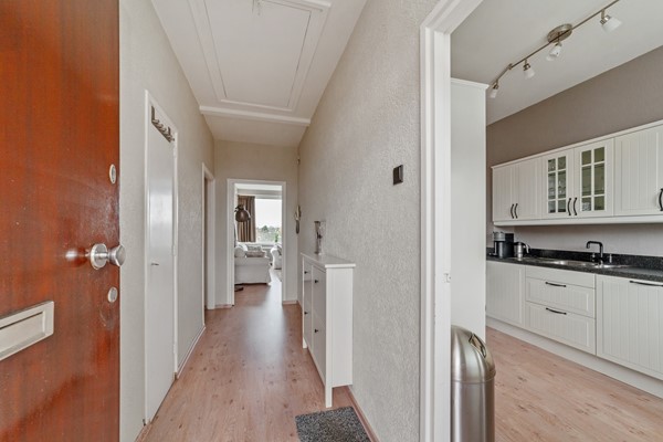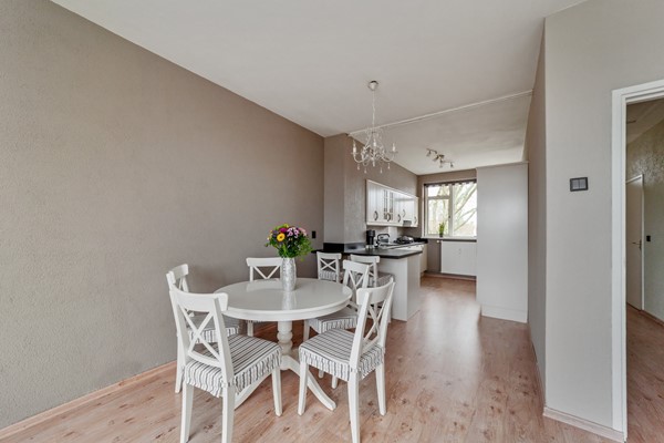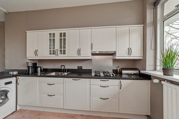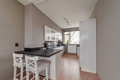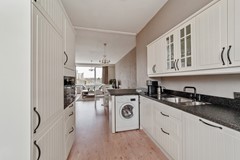 Aan de galerijzijde van de woning bevindt zich de ruim bemeten landelijke keuken met keukenblok in L- opstelling en de navolgende inbouwapparatuur: koelkast ( 2024) 4-pits gaskookplaat, combi-oven, afzuigkap en vaatwasmachine. Tevens bevindt zich hier de aansluiting t.b.v. de wasmachine.