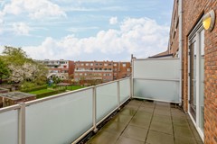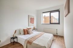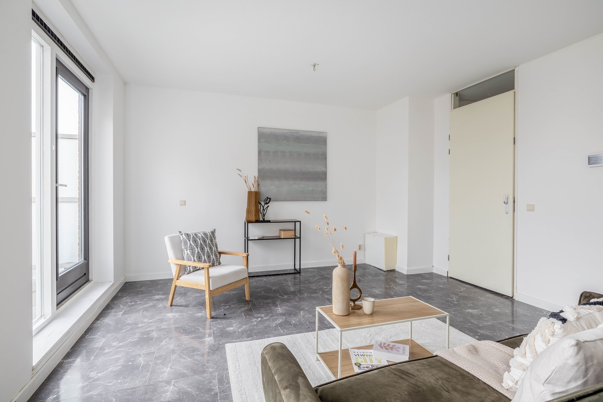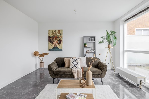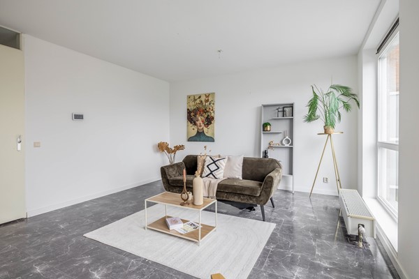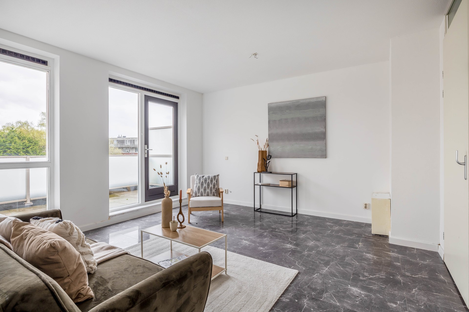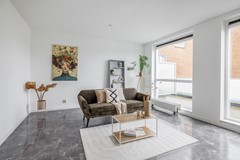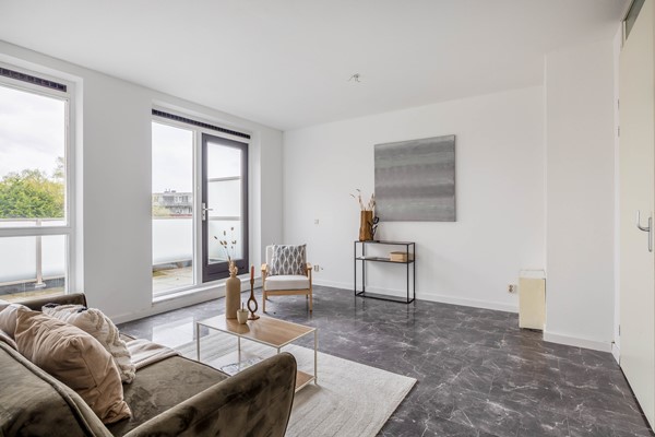 Hier stap je de lichte woonkamer binnen. Dankzij de grote raampartijen stroomt het daglicht rijkelijk naar binnen en voelt de ruimte heerlijk open en ruim aan. Vanuit de woonkamer loop je zo het balkon op het westen op. Hier geniet je van de middag- en avondzon – een perfecte plek om na een lange dag nog even buiten te zitten.