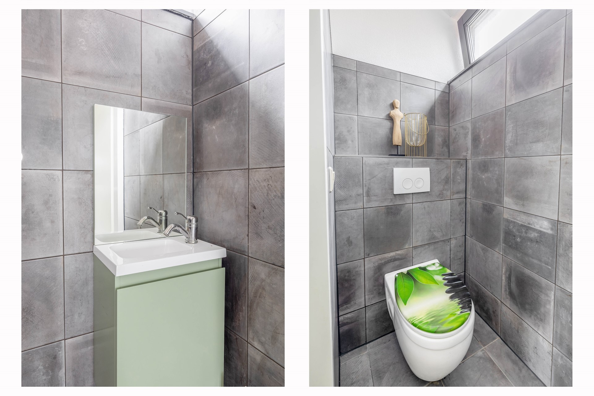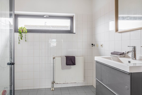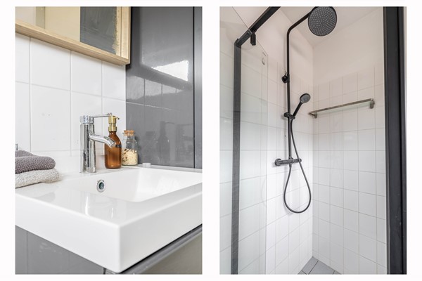 De badkamer is eenvoudig maar functioneel uitgevoerd en voorzien van een inloopdouche, wastafel en aansluiting voor de wasmachine. Daarnaast is er een praktische bergkast met de opstelplaats van de cv-ketel.