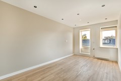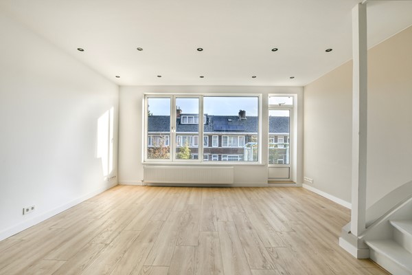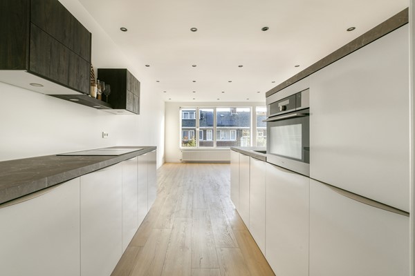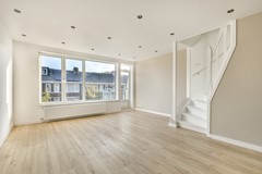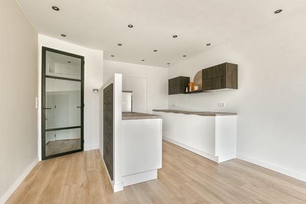 Vanuit de hal bereik je de lichte woonkamer met open keuken. De combinatie van strakke wanden, een prachtige laminaatvloer en een moderne keuken geeft deze ruimte een warme en luxe uitstraling. De woonkamer ligt aan de voorzijde van de woning en geniet van veel natuurlijk licht.