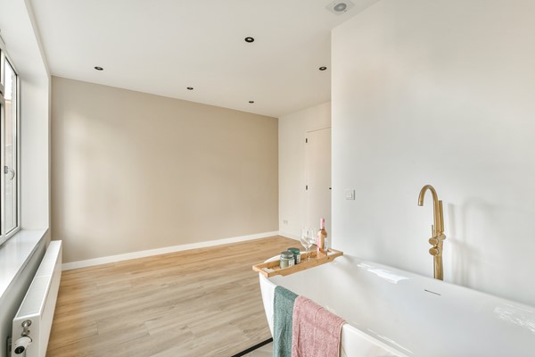 Aangrenzend aan de woonkamer bevindt zich een slaapkamer met vrijstaand ligbad. Vanuit deze kamer heb je tevens toegang tot het eerste balkon. Hier kun je letterlijk vanuit je bed zo in bad stappen, of als je dat liever hebt de ruimte inrichten als bijvoorbeeld een inloopkast of werkkamer.