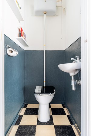 Terwijl het toilet met fonteintje keurig is onderhouden, biedt de eenvoudige badkamer (waarvan de wastafel momenteel defect is) de uitgelezen kans om een moderne doucheruimte te creëren, geheel naar eigen smaak en ontwerp.