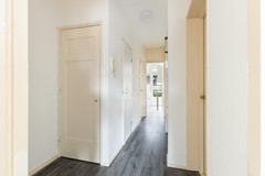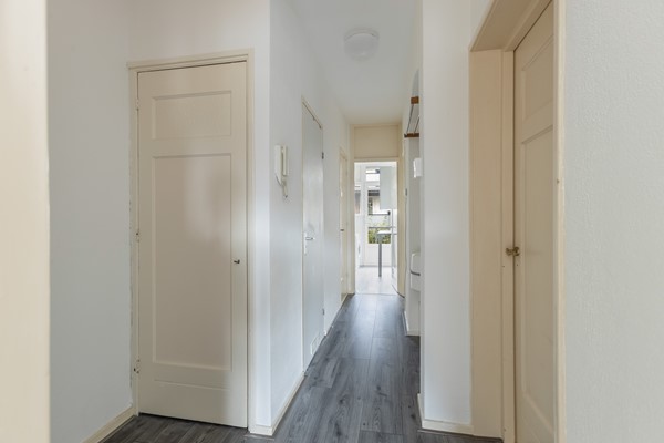 Bij binnenkomst geeft de centrale entree biedt toegang tot alle vertrekken. De indeling is nu zo dat de woonkamer tussen de 2 slaapkamers gesitueerd is (hoogte: 2,75 m), maar dit is eenvoudig anders in te delen; de muren zijn hier niet dragend.