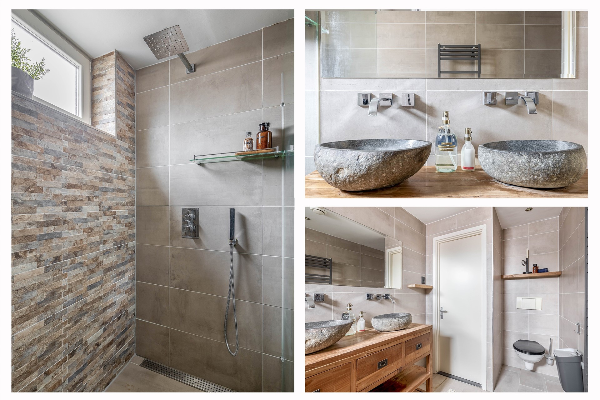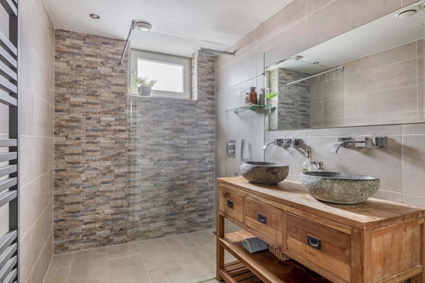 9. Badkamer met inloopdouche, toilet, dubbele wastafel en handdoekradiator