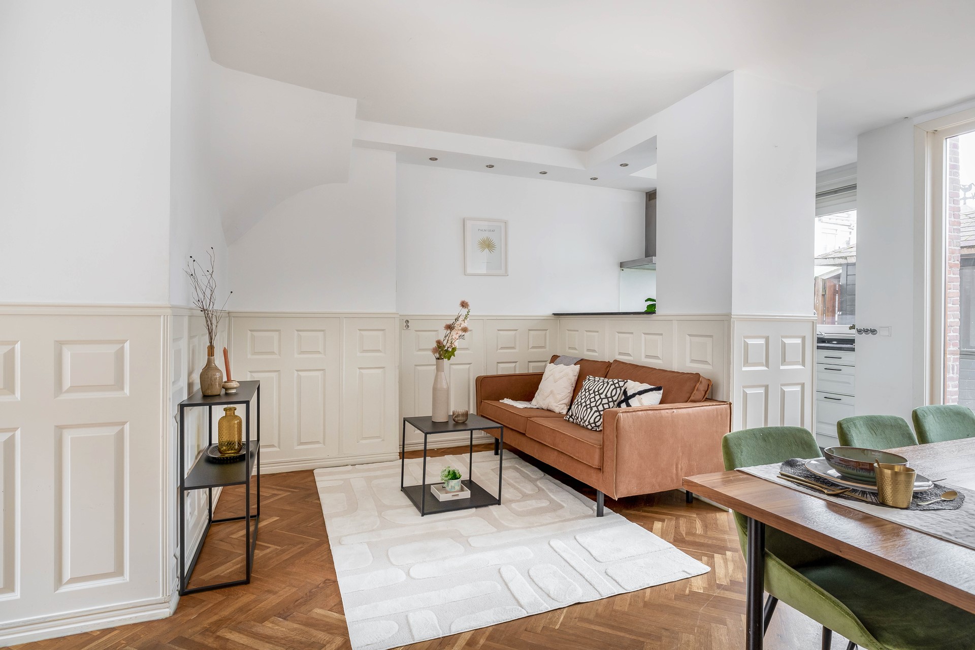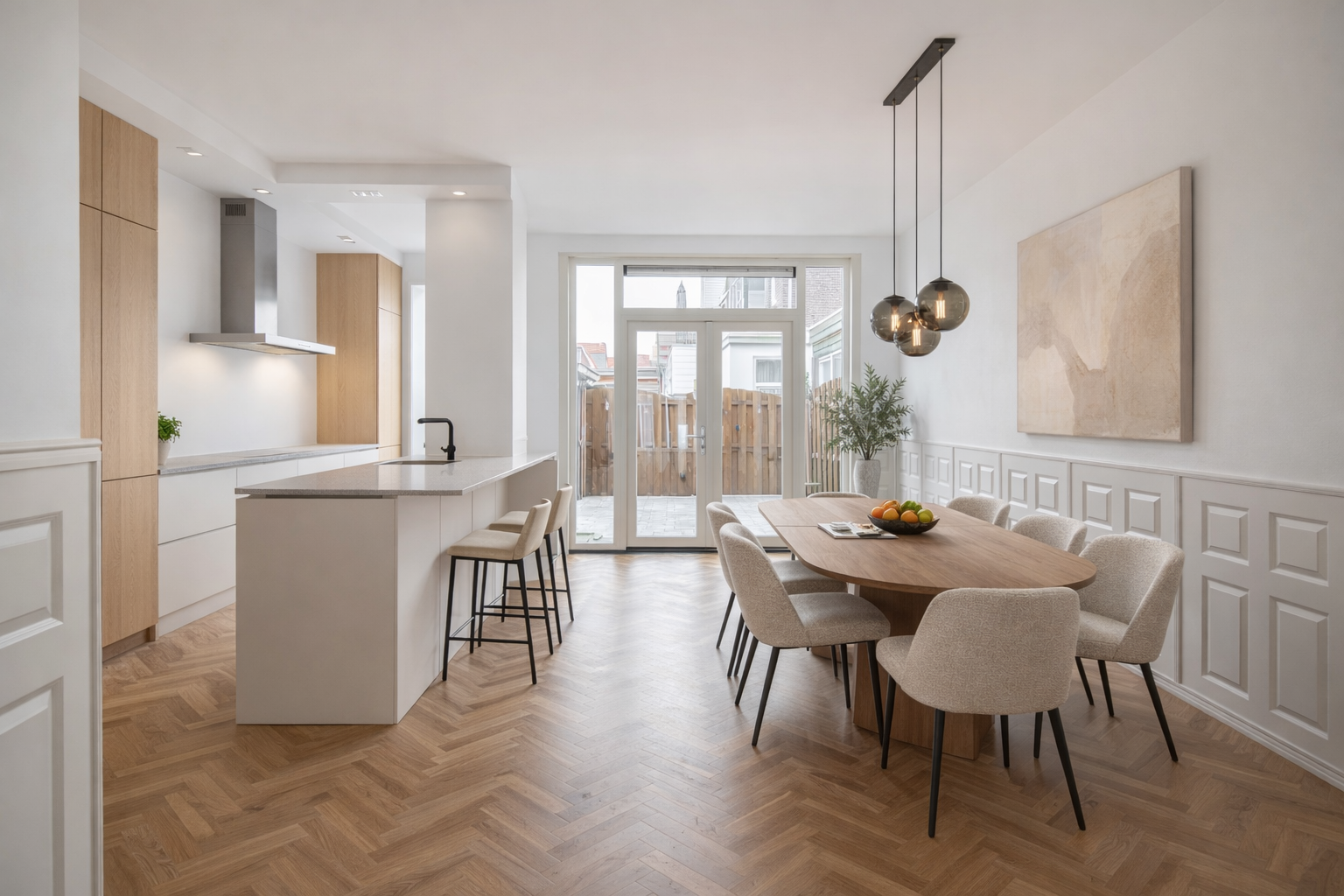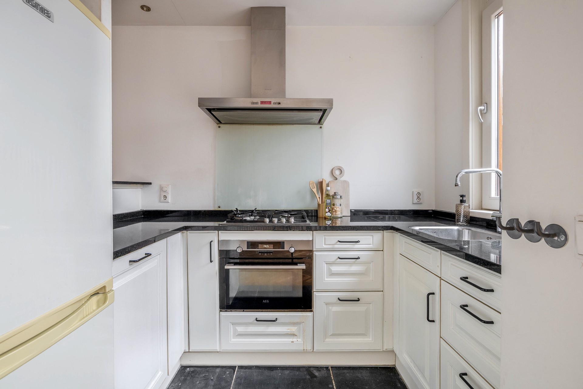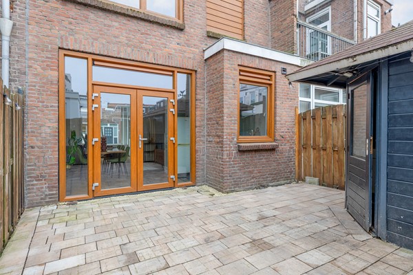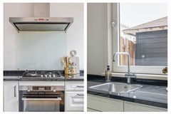 Aan de achterzijde bevindt zich de open keuken, met uitzicht op de tuin. Vanuit de keuken heb je direct toegang tot de achtertuin, gelegen op het westen – perfect om na een lange dag nog even van de zon te genieten.