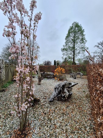 Rondom de woning is een prachtige tuin met grote kweekkas. De tuin is ideaal voor liefhebbers van natuur en buitenleven en is in verschillende delen opgesplitst. Hierdoor heb je overal weer een nieuwe kijk en maakt de tuin speels en aantrekkelijk, ook met de verschillende ornamenten. De sfeervolle vijvers vormen het hart van de tuin en trekt vogels en vlinders aan, wat zorgt voor een levendige en rustgevende sfeer. Voor de hobby tuinder is er een grote kas met fruitbomen, die perfect is voor het zelf kweken van groenten, kruiden of bloemen. Daarnaast is er een eigen waterbron geslagen voor het sproeien/watergeven in kas en tuin.