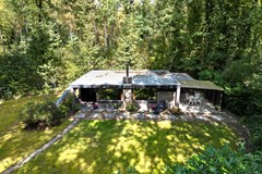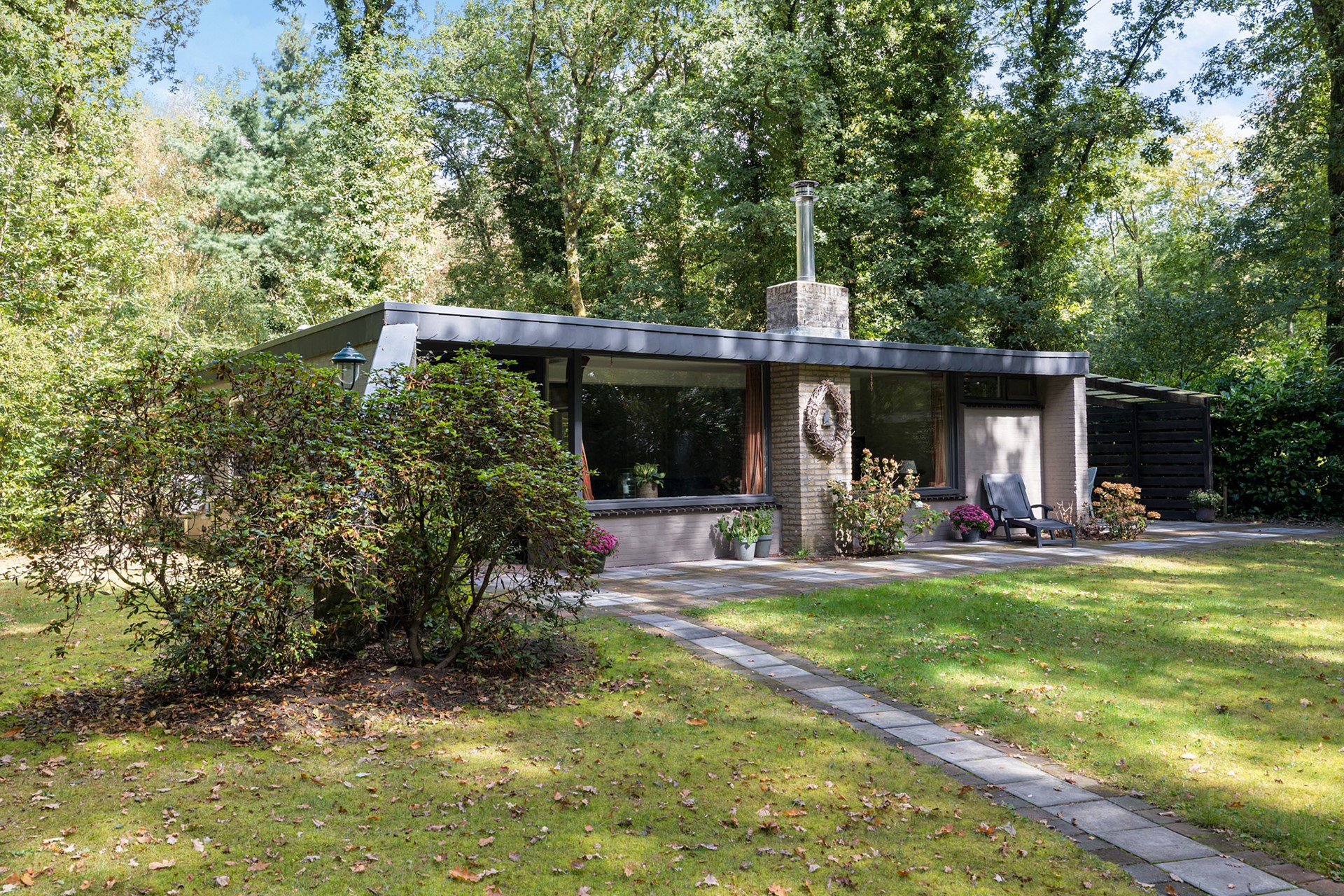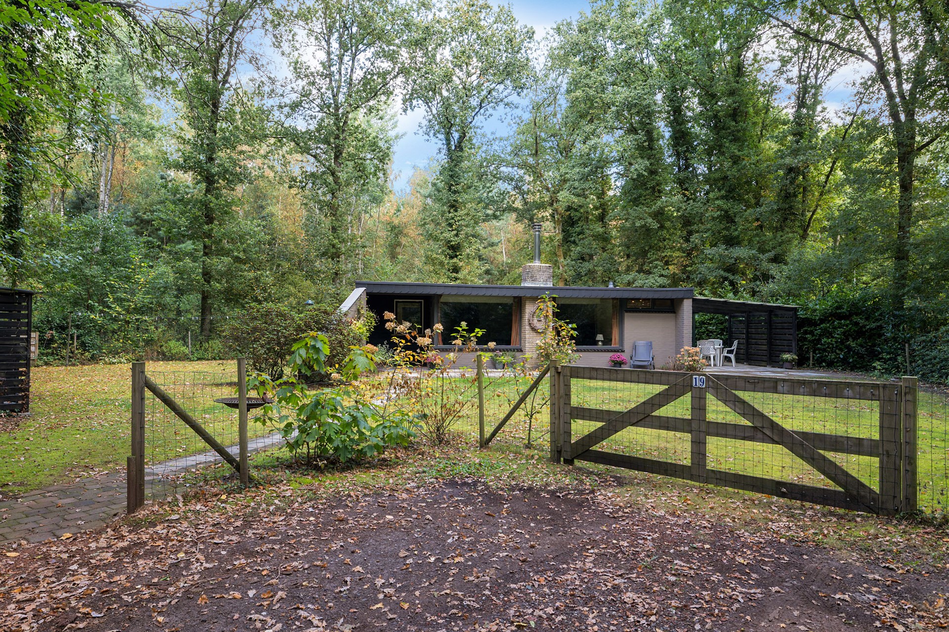 Parkeren kan je op eigen terrein. Vooraan het perceel heb je de mogelijkheid om één tot twee auto’s te parkeren. Vanaf de parkeerplaats loop je via de poort richting de bungalow.