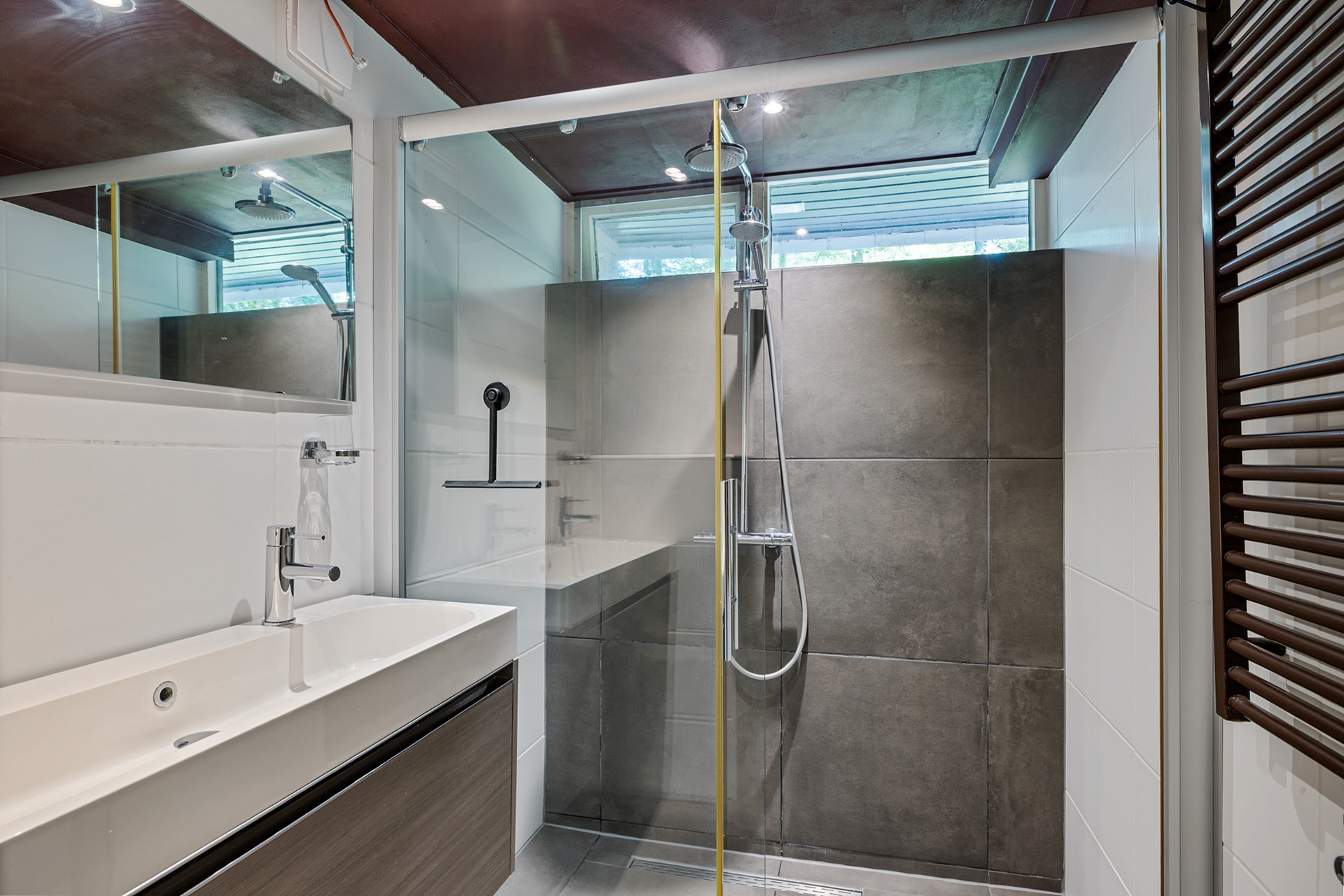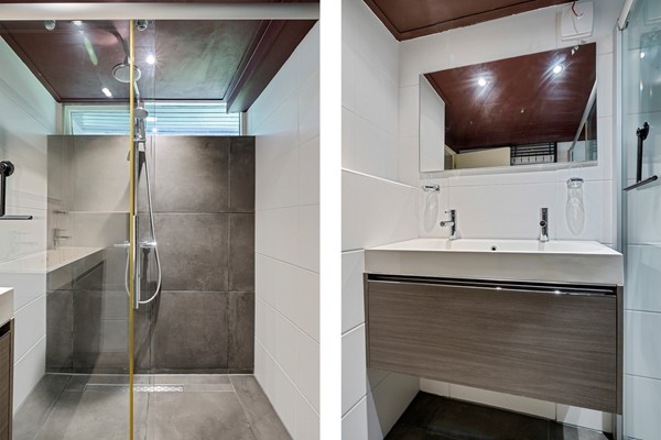 Het aparte toilet met fonteintje en de badkamer zijn gedeeltelijk vernieuwd in 2021. De badkamer is voorzien van een ruime inloopregendouche, een badkamermeubel met dubbele wastafel en spiegel, designradiator en mechanische afzuiging.