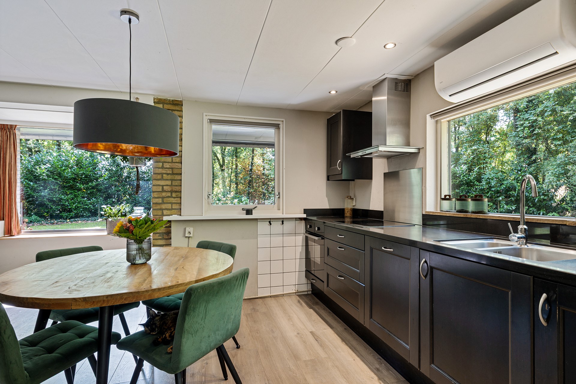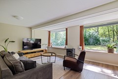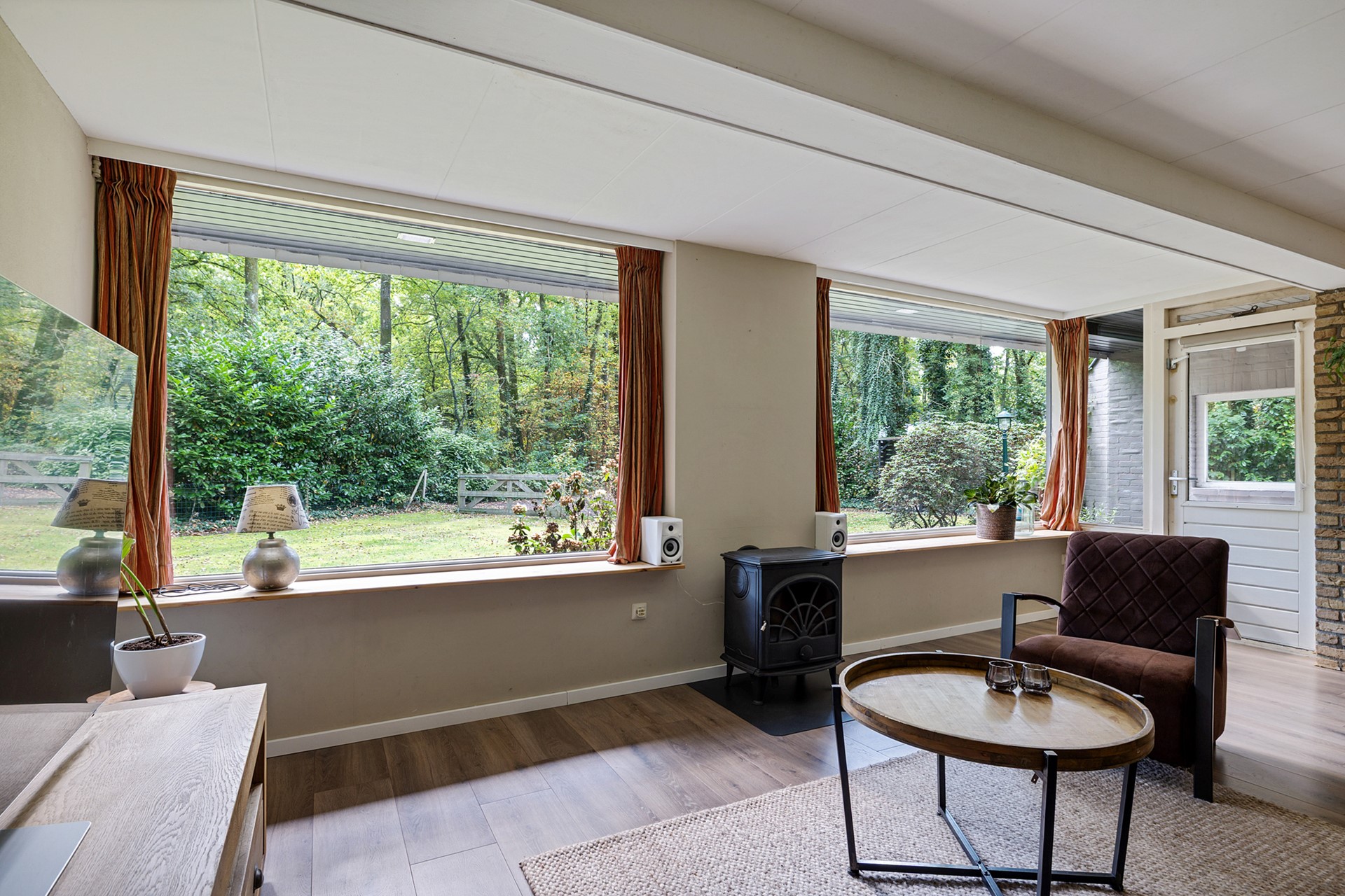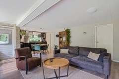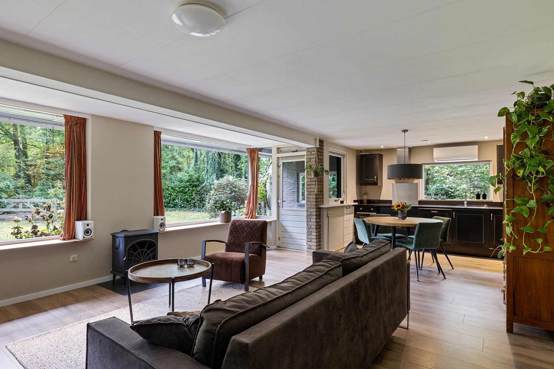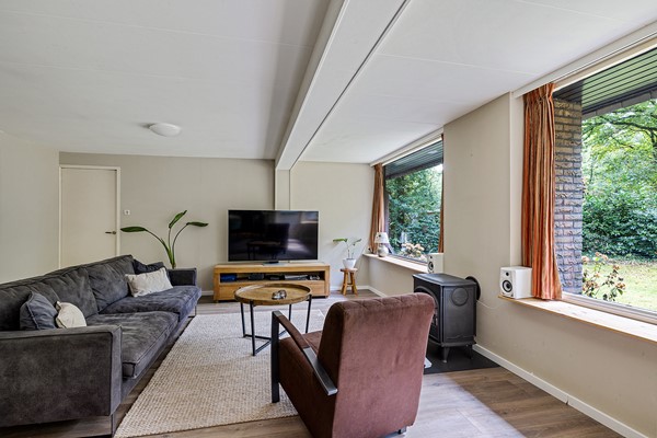 Het leefgedeelte met open keuken is voorzien van grote ramen waardoor de gehele ruimte erg licht is en in goede verbinding staat met de tuin. Je hebt altijd uitzicht op het groen. Door de houtkachel kun je niet alleen besparen op je gasrekening, je zorgt hiermee ook voor een gezellige en knusse sfeer.