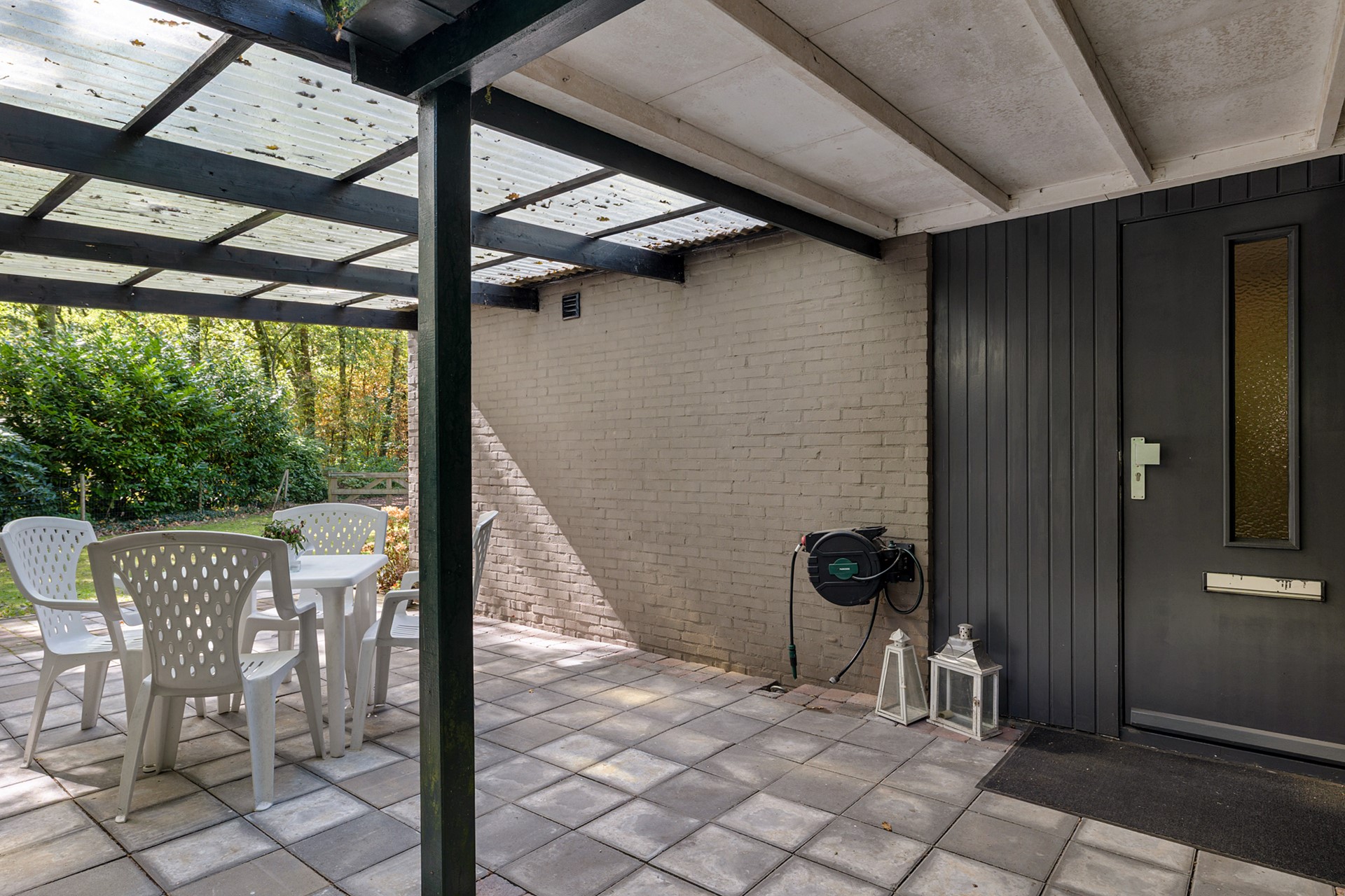 De voordeur bevindt zich aan de zijkant van de bungalow. Hier vind je ook direct een ruimte overkapping waar je ook met slechter weer goed kunt zitten.