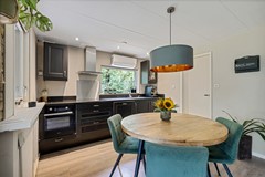 Vanaf het zitgedeelte loop je zo door naar het eetgedeelte en de open keuken. Vind je hier nog een extra deur naar de tuin, ook deze deur is weer overkapt waardoor je ook hiermee de bungalow altijd droog binnen kan binnenstappen.