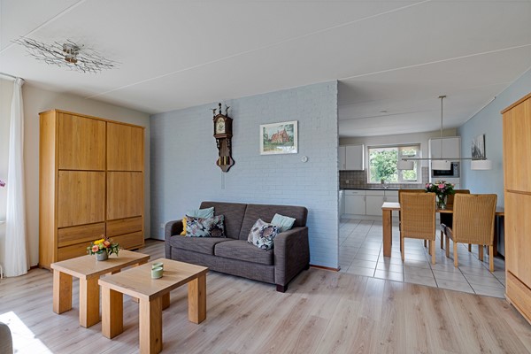De leefruimte op de begane grond heeft veel lichtinval en is een fijne plek om met z’n allen samen te komen. Aan de voorzijde van de woning is het groenplantsoen je uitzicht. Tussen het zitgedeelte en de keuken is voldoende ruimte om met het hele gezin te eten.