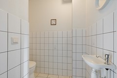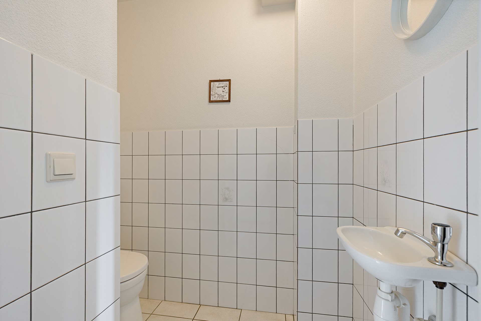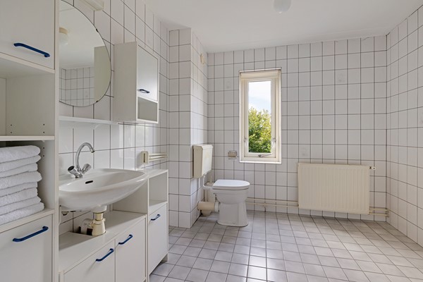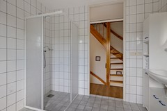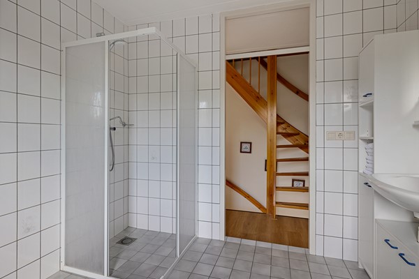 De nette, volledig betegelde badkamer (1993) is voorzien van een douchecabine, een tweede toilet en een wastafel met extra bergruimte.