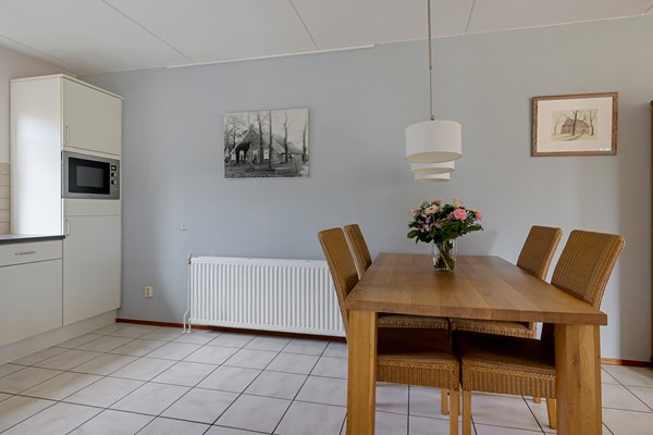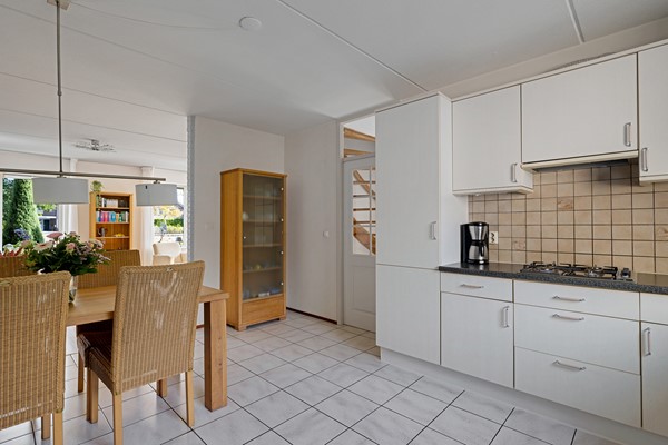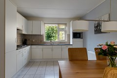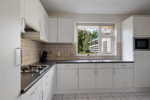 De nette open keuken in L-vormige opstelling heeft zicht naar de achtertuin. De keuken (1993) is voorzien van een inbouw combi-magnetronoven, een koelkast, een dubbele spoelbak en een 4-pits gaskookplaat met een afzuigkap.