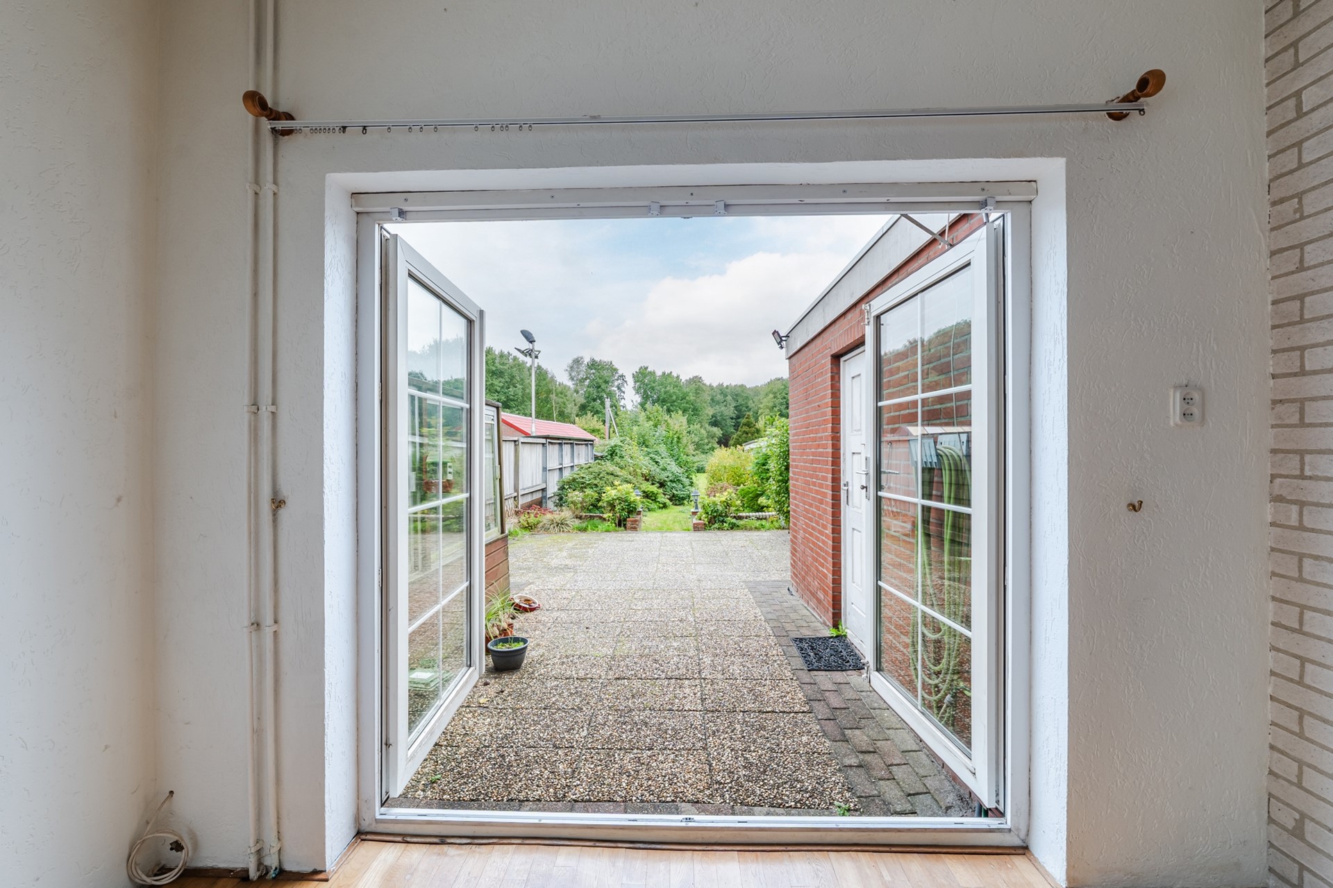 - Woonkamer met parketvloer en openslaande deuren naar de tuin
