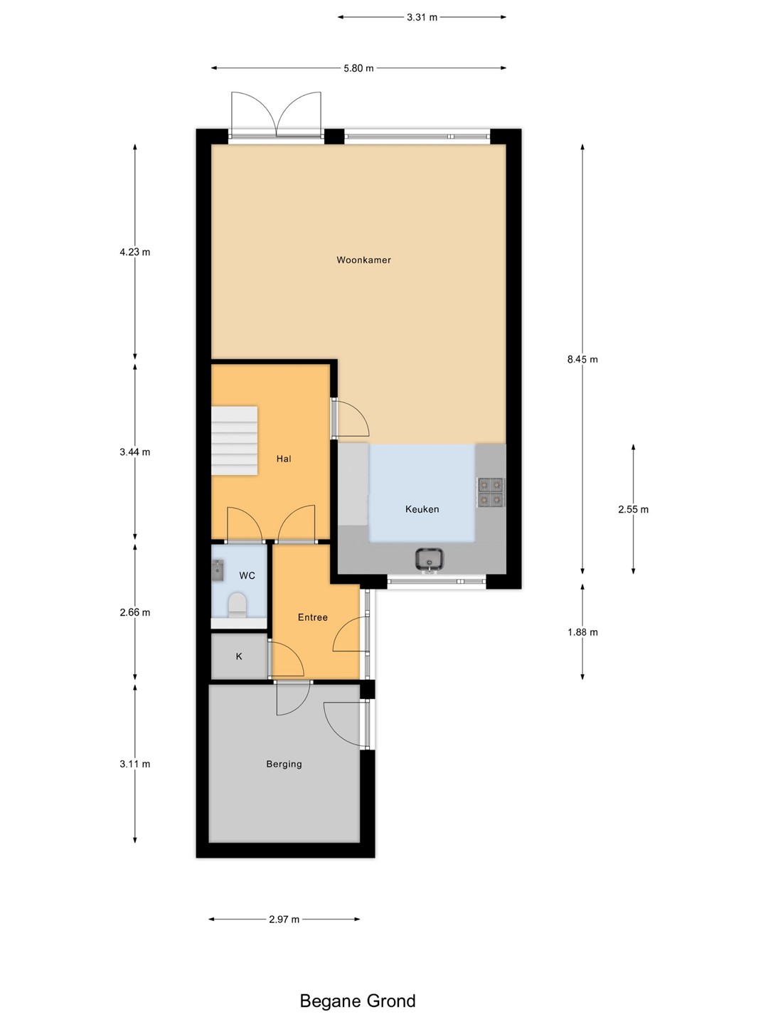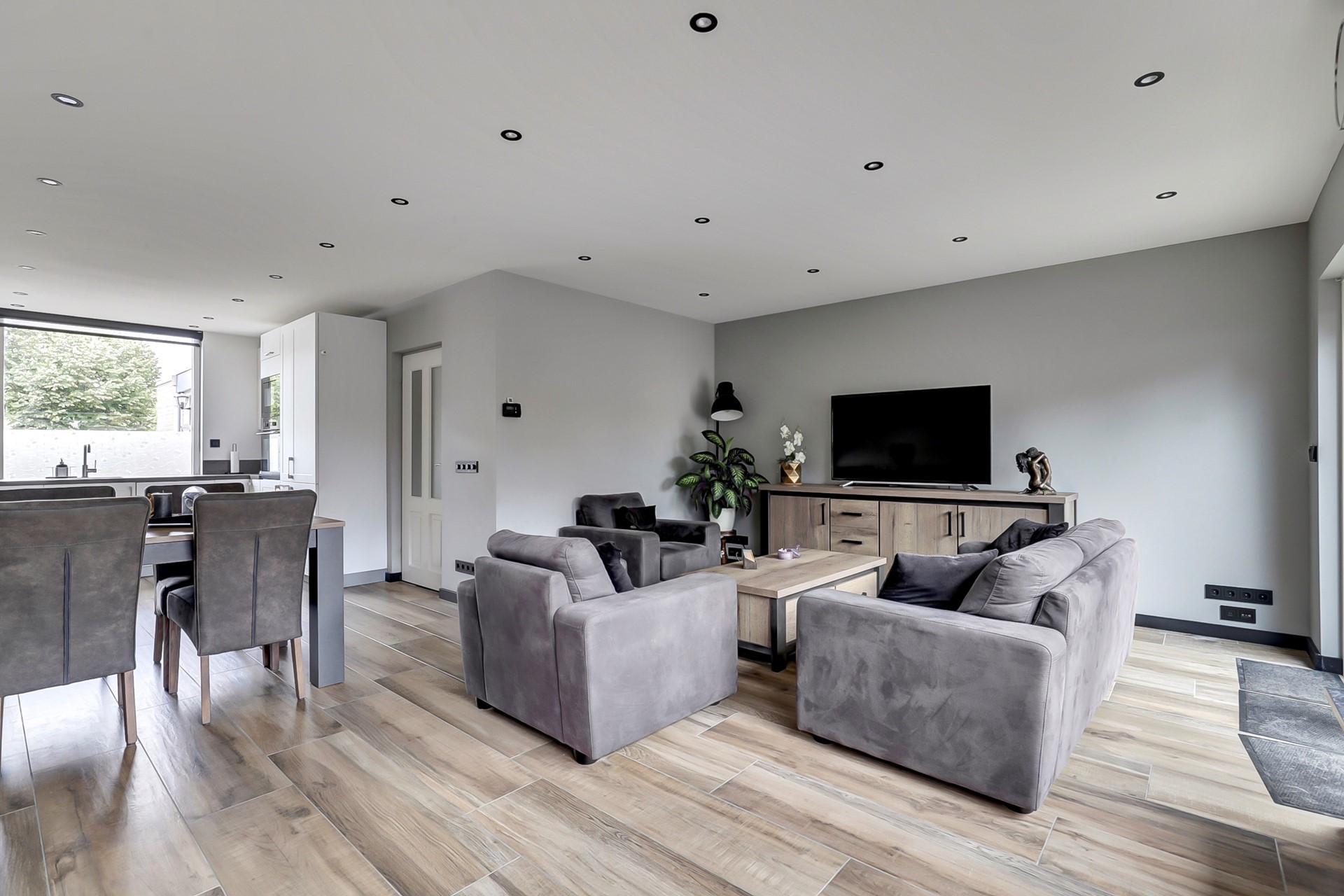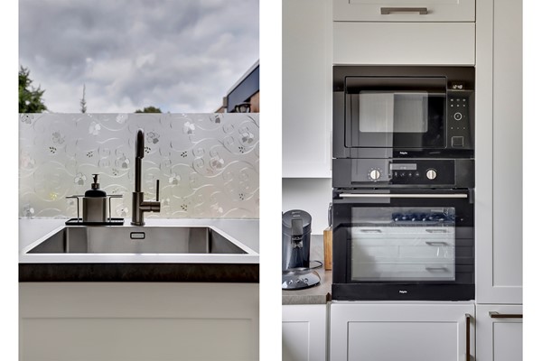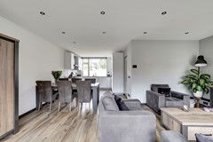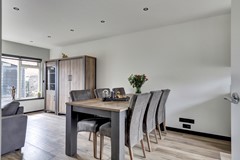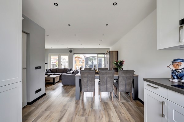 De in 2022 opgeknapte begane grond is als volgt ingedeeld: entree, met aan linkerzijde toegang tot de grote berging (311 x 297 met loopdeur, wanneer u hier met kinderen gaat wonen, dan zal dit waarschijnlijk de hoofdingang worden, vertel het me later maar, of her klopt) en aan rechterzijde tot de royale hal met heerlijk ruim toilet, de meterkast en toegang tot de grote L-vormige living van ca. 40 m², bestaande uit de aan de tuinzijde gelegen - 5.80 meter brede - woonkamer met openslaande tuindeuren en de aan de voorzijde gelegen open keuken met luxe U-vormige inbouwkeuken v,v. -apparatuur. Ondanks het feit dat er geen kruipruimte is, is de vloer van de hal, woonkamer en keuken in 2021 toch geïsoleerd, die gedeelten en ook toilet en badkamer zijn voorzien van vloerverwarming (foto's zijn aanwezig) en opnieuw afgewerkt met keramisch parket. In elke hoek van de woonkamer zitten er COAX EN Data aansluitingen en er zijn maar liefst 37 stopcontacten in de woonkamer en de keuken. En 'er ligt Perilex onder de keuken'. De wanden en plafonds werden gladgestuukt en in de plafonds werden inbouwspots verwerkt.