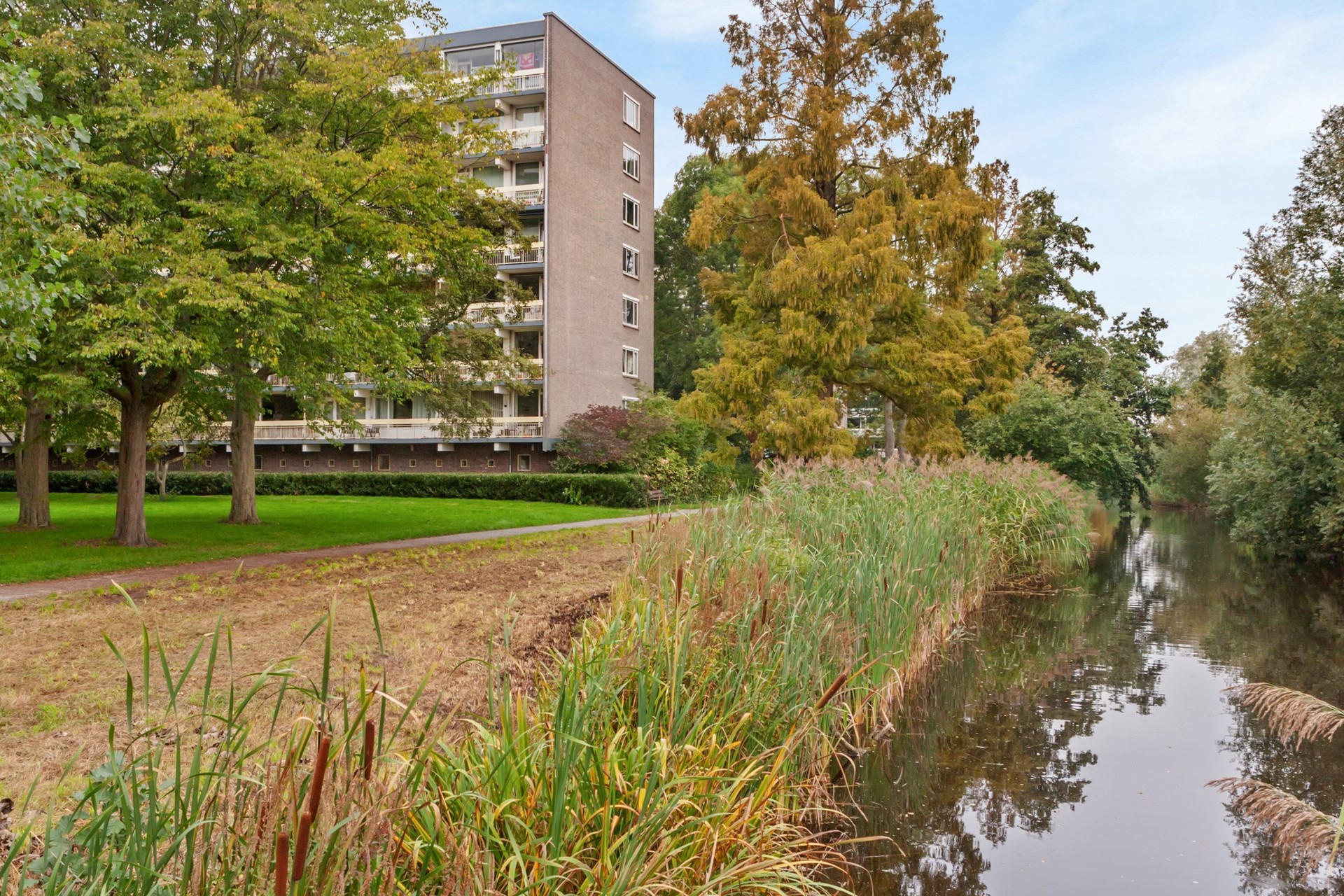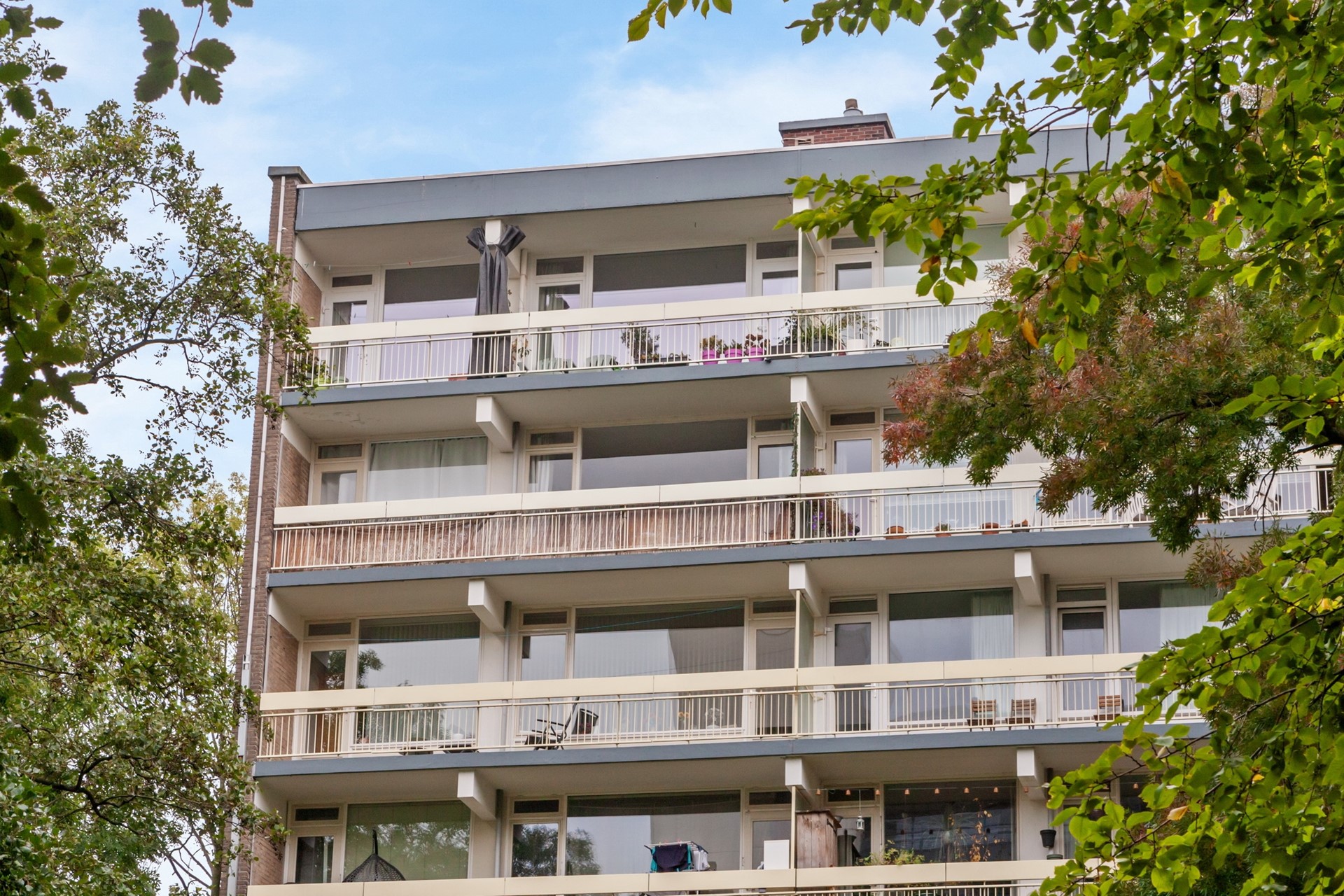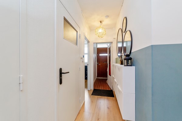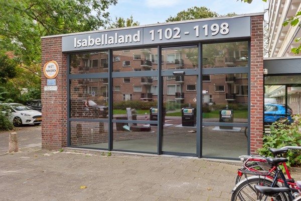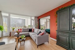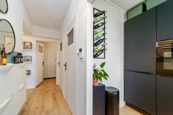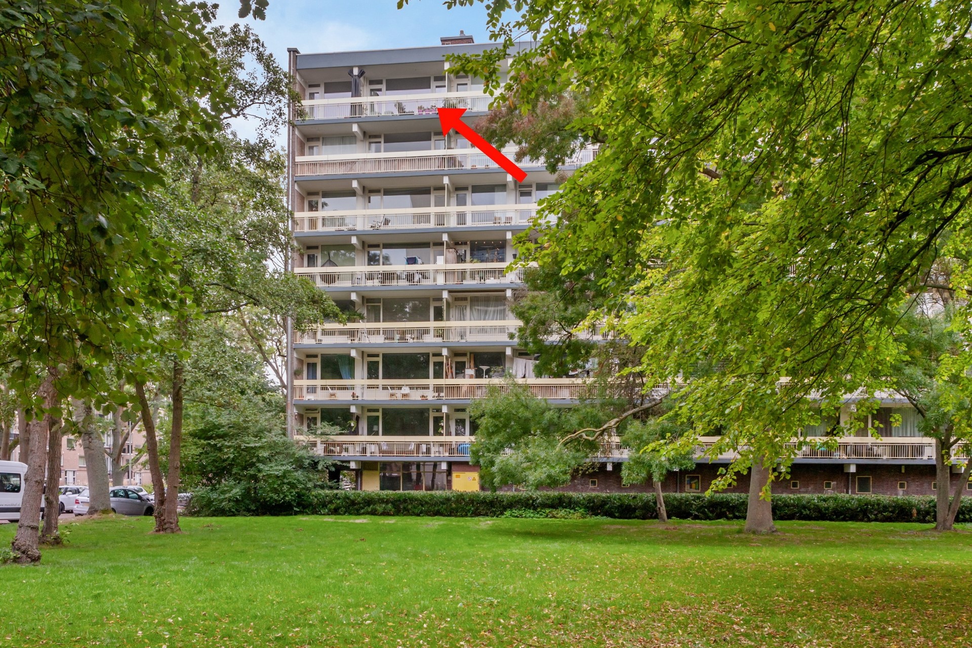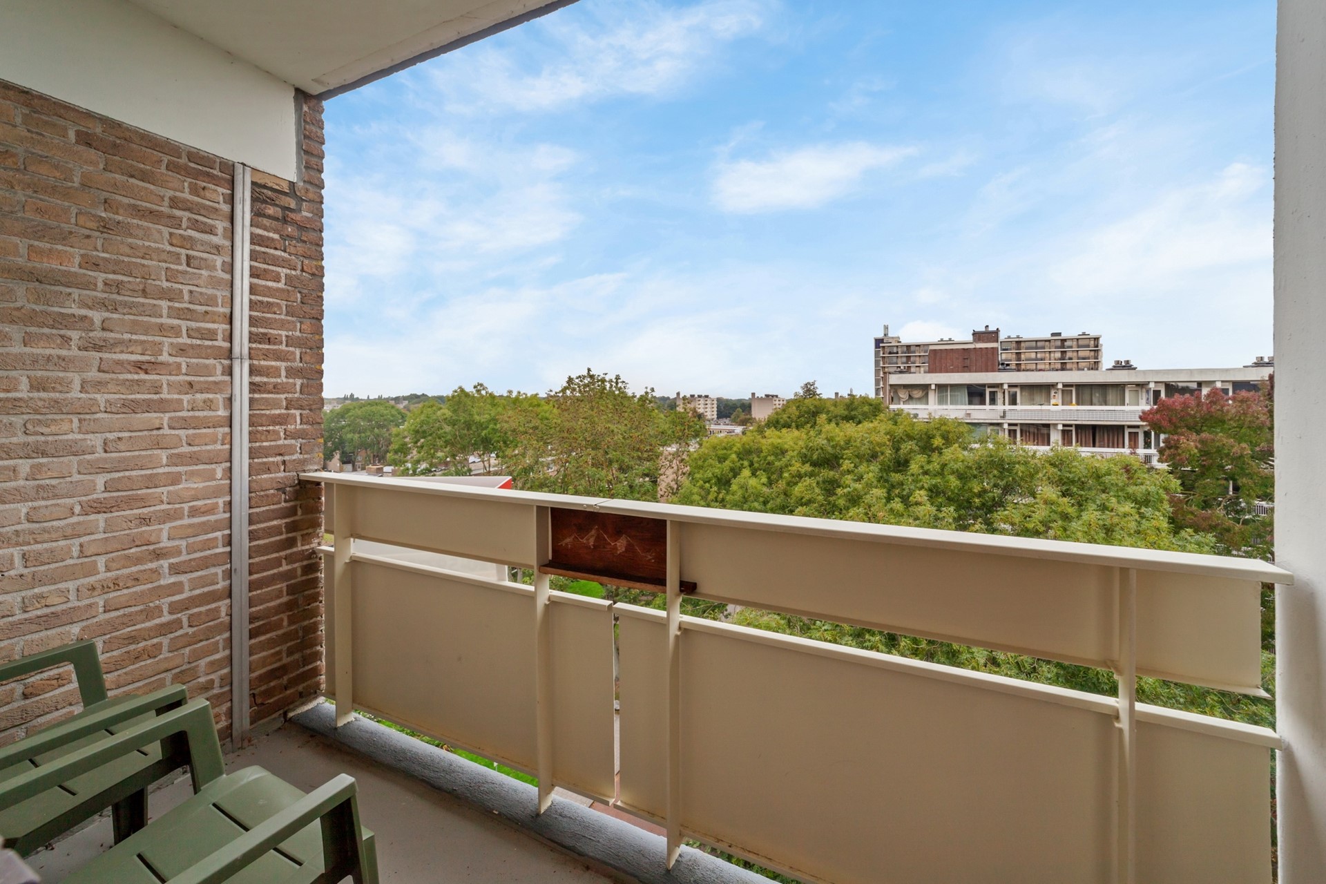 Secure entrance with mailboxes and doorbell panel, elevator to the 7th floor. Short private gallery with evening sun and views of The Hague city center and, on the other side, the greenery of De Horsten.
