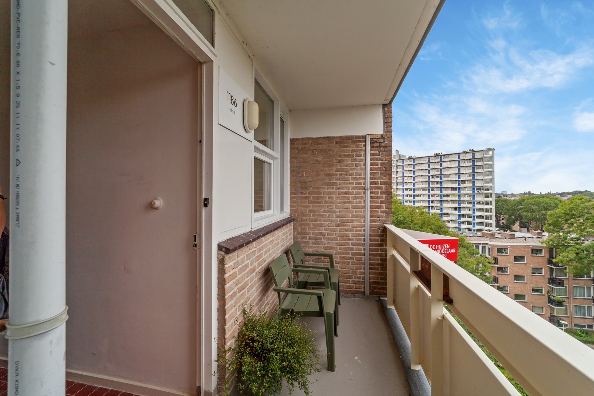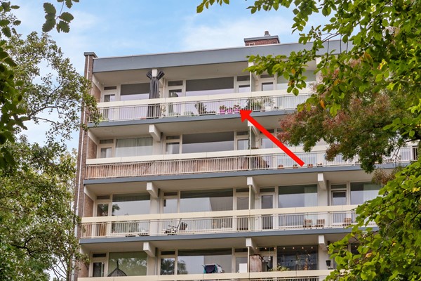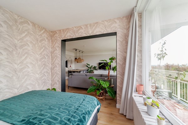 Zowel vanuit de woonkamer als vanuit de slaapkamer is er een deur naar het ruime balkon over de volle breedte op het Zuid-Oosten met weids uitzicht op groen.