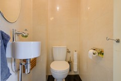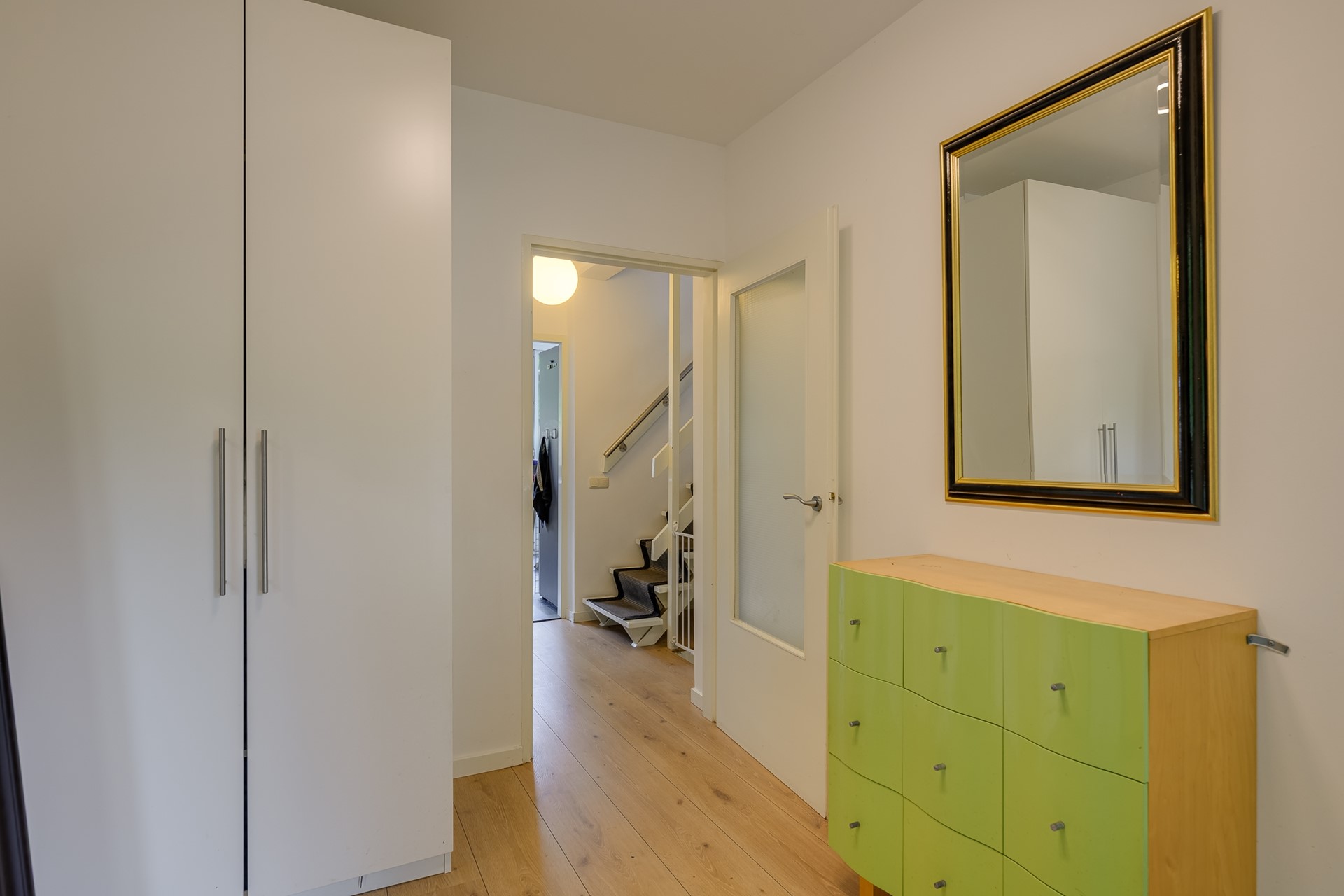 You arrive on a quiet, leafy street where children still play on the sidewalk. In front of the house is a wide driveway with space for two cars and a garage that can be used both practically and creatively. Inside, you are welcomed by a bright vestibule with a modern toilet and staircase.