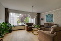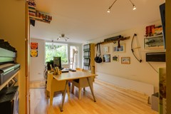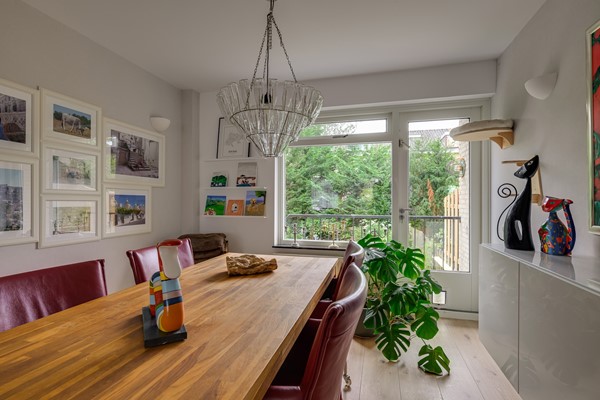 On the first floor, you'll be surprised by the enormous living room that spans the entire length of the house. Thanks to windows on both sides, the space is bathed in light. At the rear, you step directly onto the balcony, where you overlook the garden and the greenery of the neighborhood. Here you can enjoy long evenings, a good book, or simply the peace and quiet.