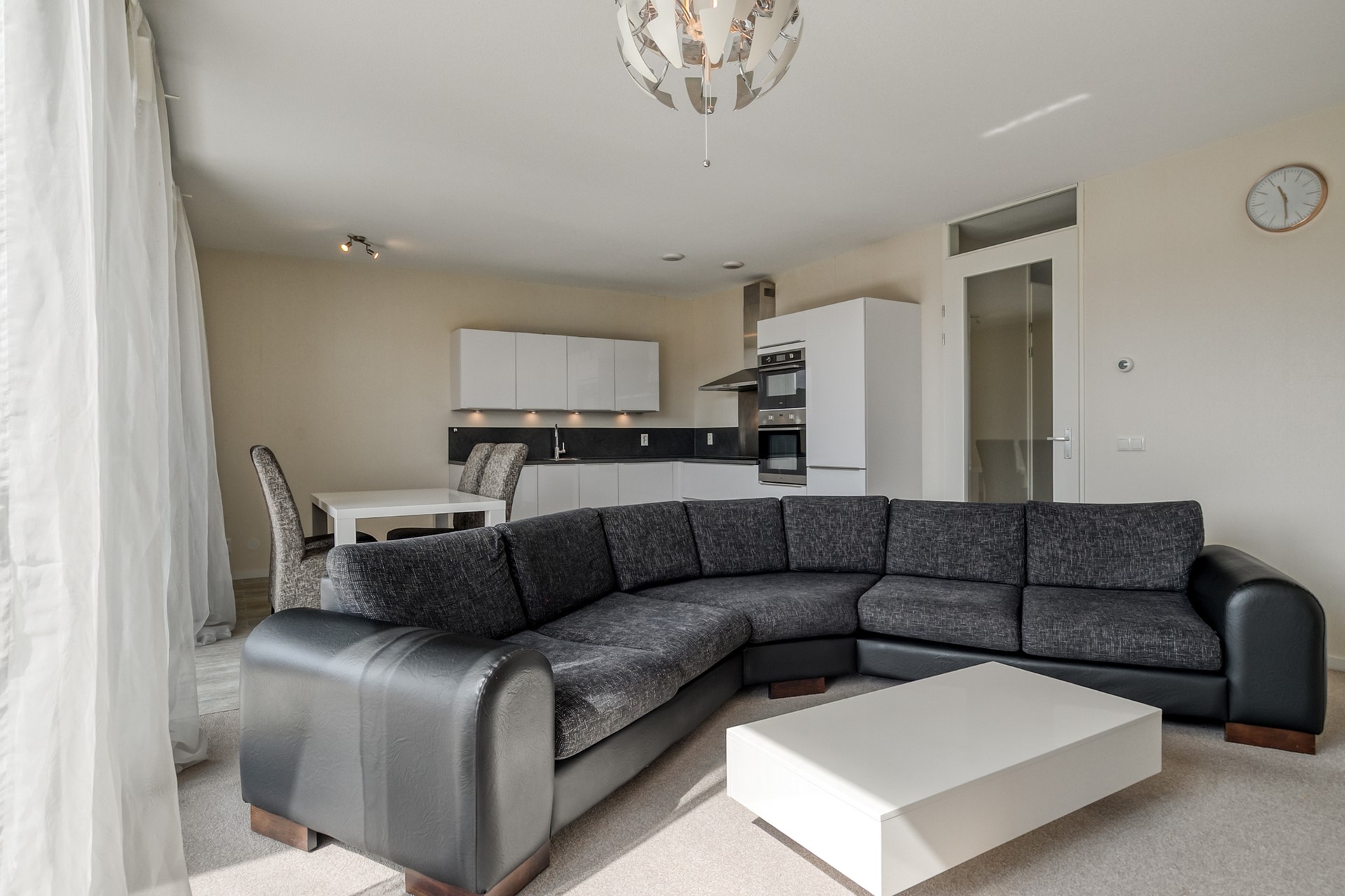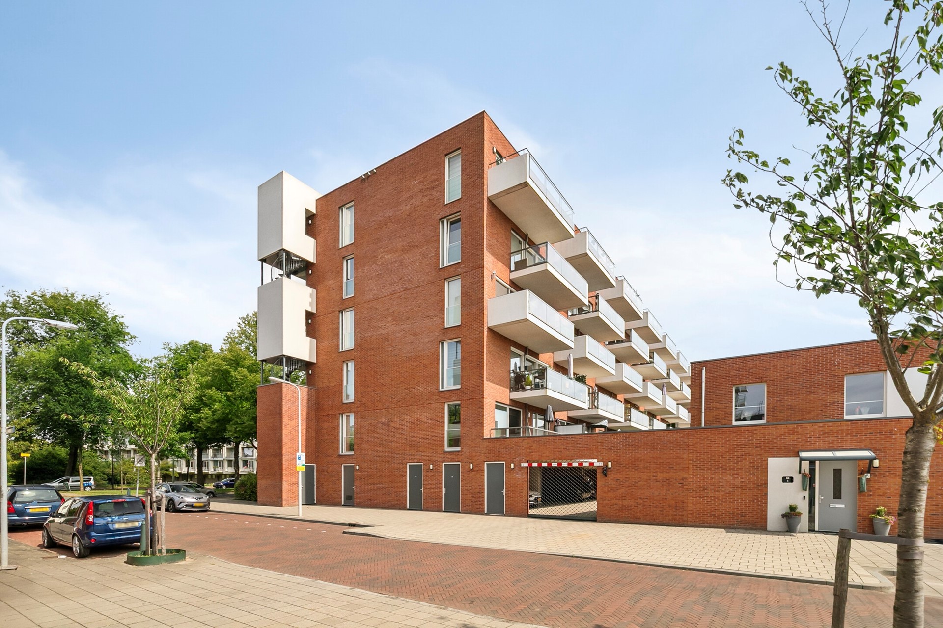 The apartment includes a lovely living room with open-plan kitchen, two spacious bedrooms, a bathroom with both a bathtub and walk-in shower, a separate toilet, and—very convenient—a separate laundry room. Your car will be safely parked in your own spot in the secure, covered garage, and there’s also a private bike storage room with easy access from the outside of the complex.