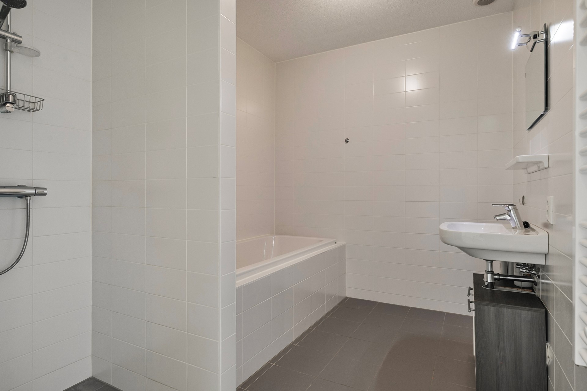 * Bathroom with bathtub, walk-in shower, sink, and designer radiator