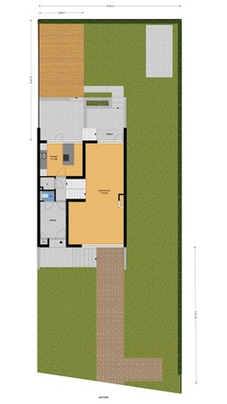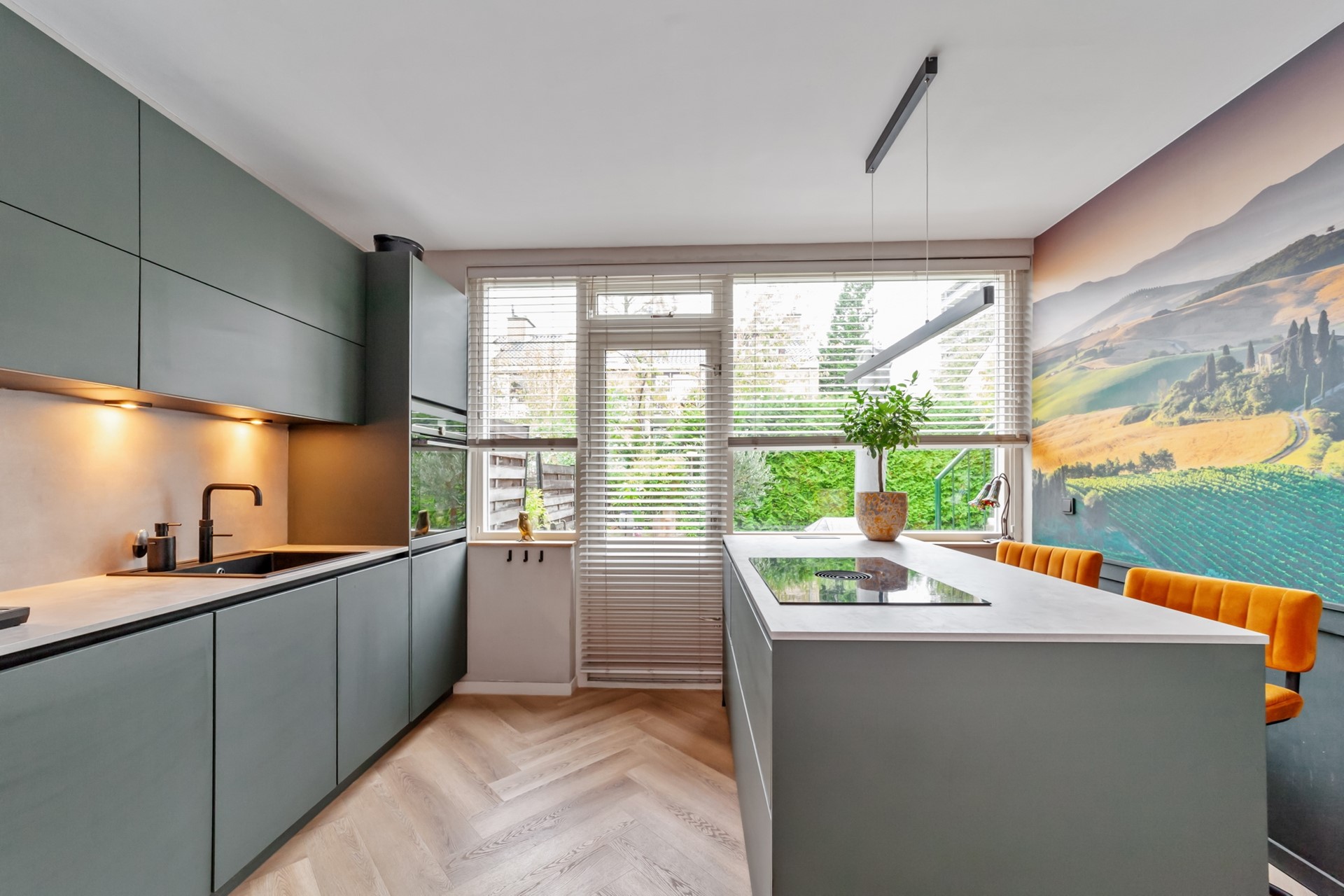 Voortuin, entree, hal, hangend toilet met fontein, gang met provisiekast/bergruimte, ruime (woon)keuken met kookeiland een inductiekookplaat inclusief ingebouwde afzuiging, koel-vriescombinatie, vaatwasser en oven. Visgraat PVC vloer.
