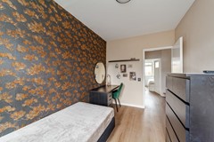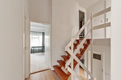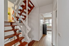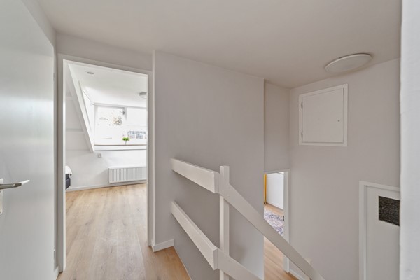 Overloop, gastenbadkamer met inloopdouche en wc, voorslaapkamer, slaapkamer aan de achterzijde (tuinzijde).
