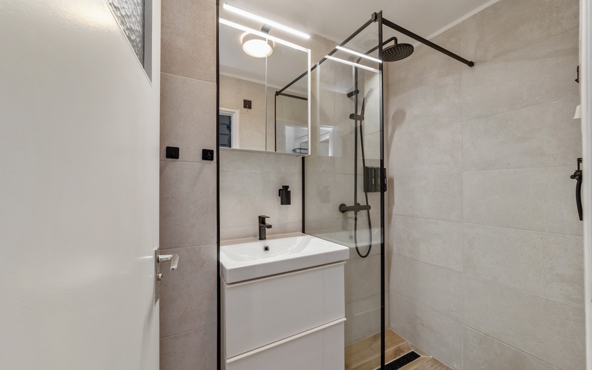 The kitchen also provides access to the spacious, charming, and playful back garden with decking, tiles, and (outdoor) stairs to the living room.
