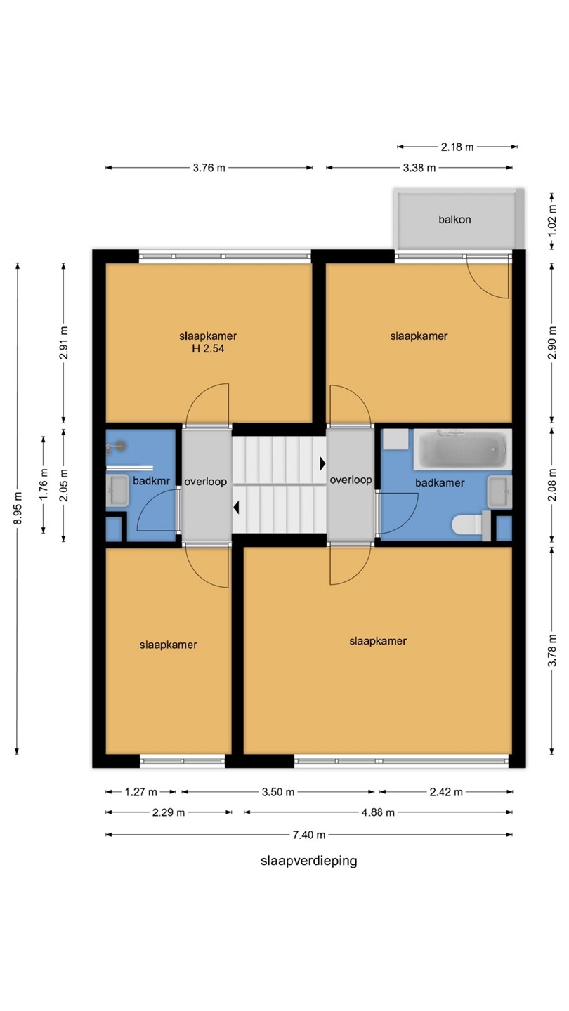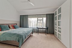 Overloop, ruime ouderslaapkamer, badkamer voorzien van ligbad, douche, wc en vaste wastafel, slaapkamer aan de achterzijde met toegang tot het achterbalkon.