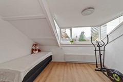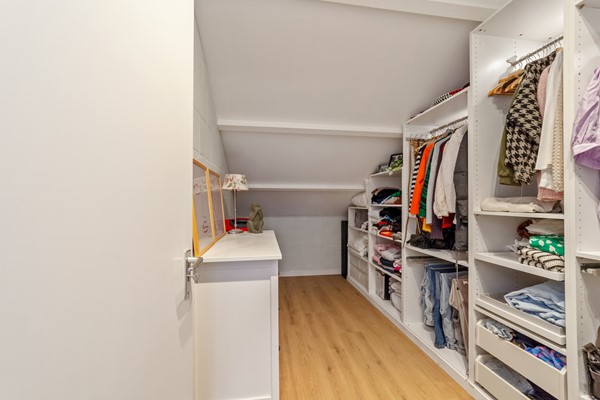 Overloop, achter gesitueerde slaapkamer met dakkapel, walk-in closet aan de voorzijde, technische ruimte met C.V.-combiketel en een fonteintje.