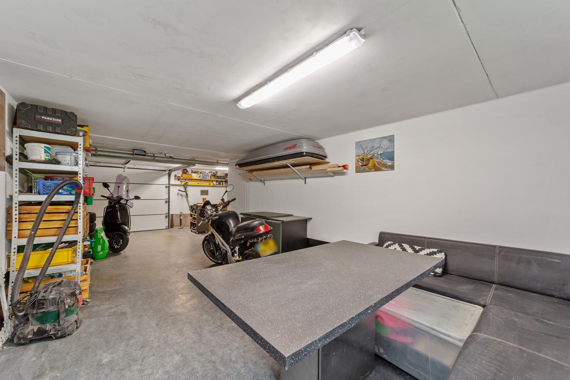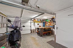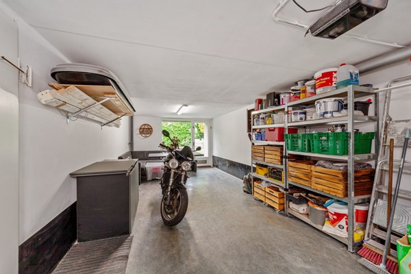 Grote garage met elektrisch bedienbare deuren, met ruimte voor 2 auto’s. Door de extra breedte aan de voorzijde is er ook voldoende plaats voor de fietsen en voor een wasmachine/droger.