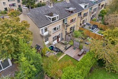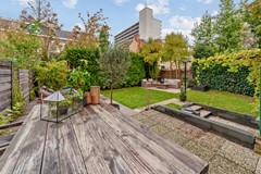 Tevens is vanuit de keuken toegang naar de ruime sfeervolle en speelse achtertuin met vlonders, tegels en (buiten) trap naar de woonkamer.