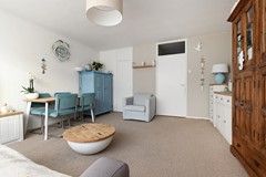 The hallway leads to the spacious 21 m² living room. Located at the rear of the apartment, the living room enjoys abundant natural light thanks to its favorable southwest orientation. The living room offers views of greenery and a partial view of the Mariahoeve shopping center.