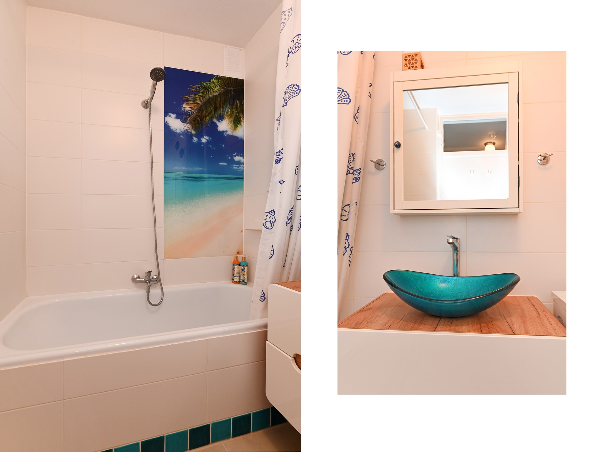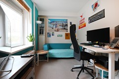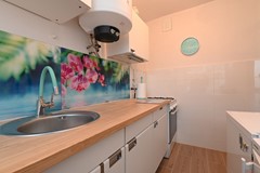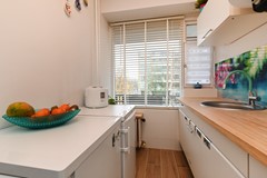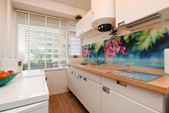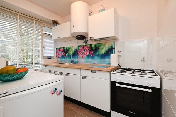 De keuken ligt aan de galerijzijde en voorzien van veel daglicht. De keuken biedt precies wat je nodig hebt en is voorzien van de benodigde apparatuur en opbergkasten. Een goede basis om te beginnen, maar je kunt het ook naar eigen smaak upgraden. Hier hangt ook de elektrische boiler (huur) voor warmwater.