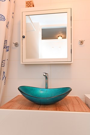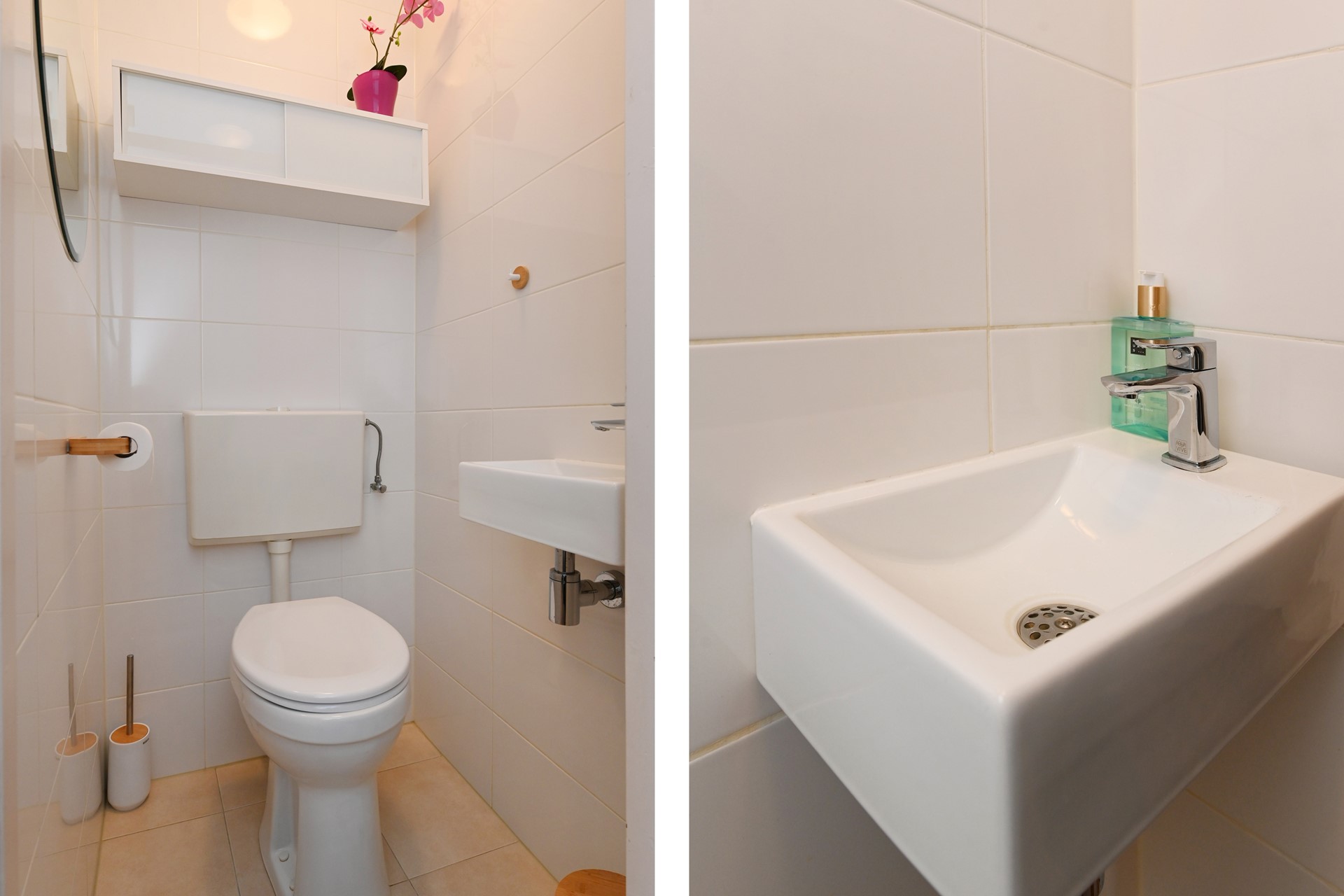 De woning heeft een inpandige badkamer voorzien van een bad, wastafel en opstelplaats voor de wasmachine/droger. De badkamer heeft een deur naar de slaapkamer gelegen aan de achterzijde van de woning. In de hal is er een apart toilet met fonteintje beschikbaar.