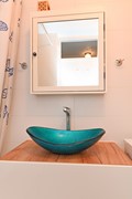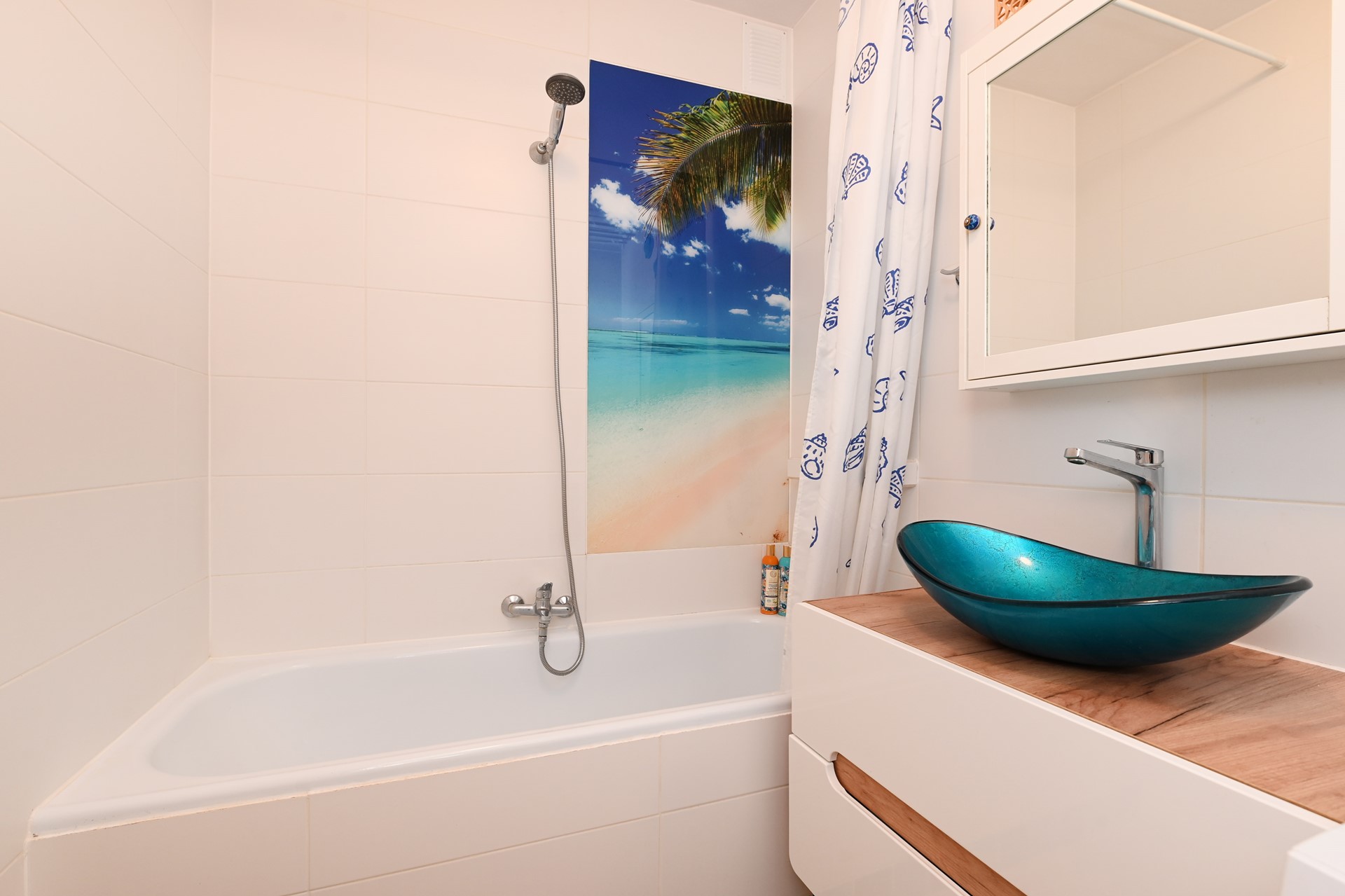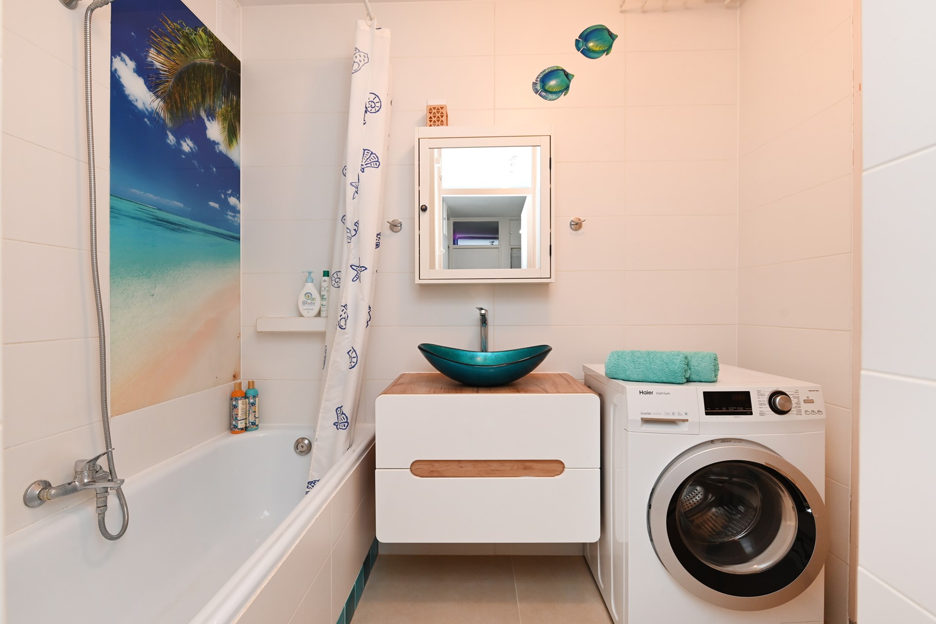 The kitchen is located on the gallery side and enjoys plenty of natural light. It offers everything you need and is equipped with all the necessary appliances and storage cupboards. It's a good starting point, but you can also upgrade it to your own taste. The electric boiler (rental) for hot water is also located here.