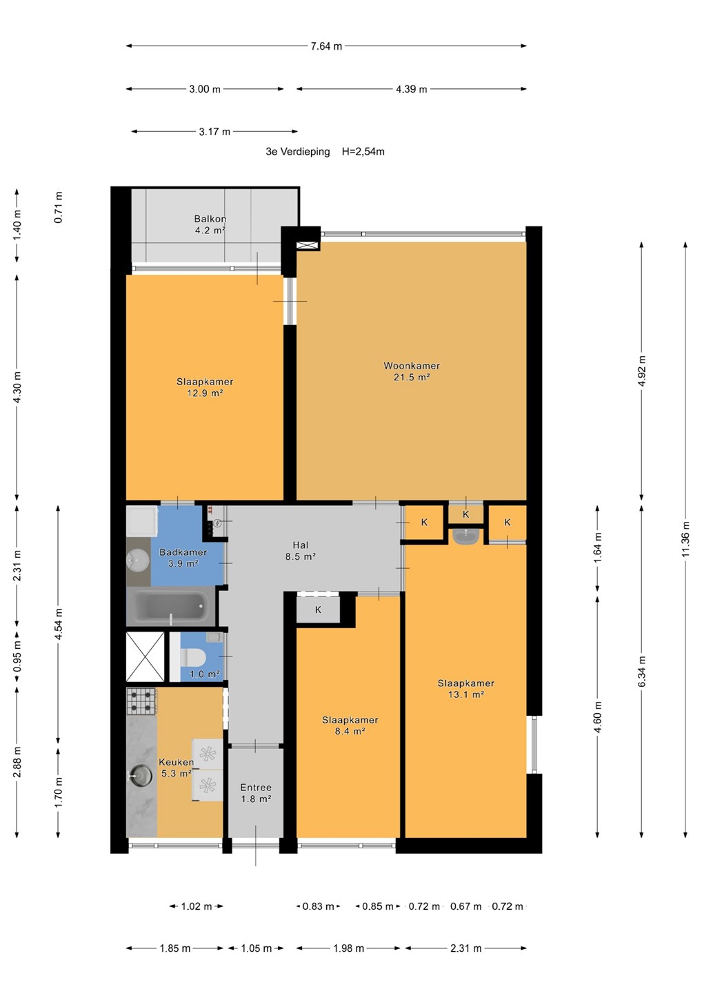 Er zijn drie slaapkamers aanwezig; één aan de galerijzijde, één aan de hoekzijde en één aan de achterzijde van het appartement met zonnig balkon op het Zuidwesten. Deze laatste slaapkamer is via de woonkamer toegankelijk. Je zou er ook voor kunnen kiezen om een deur in de hal te creëren voor een directe toegang! Twee slaapkamers zijn ruim met maar liefst 13 m2. De kleinere slaapkamer van ruim 8 m2 wordt op dit moment gebruikt als werk-/hobbykamer en deze slaapkamer is gelegen aan de voorzijde van de woning.