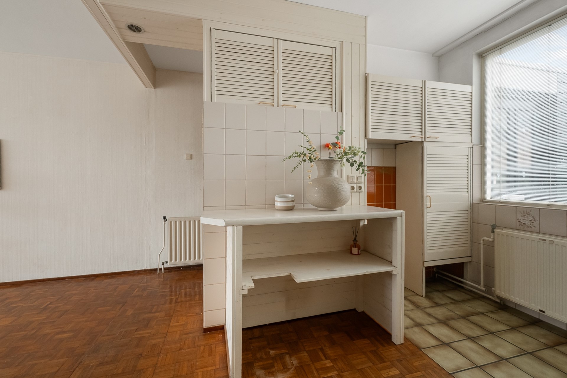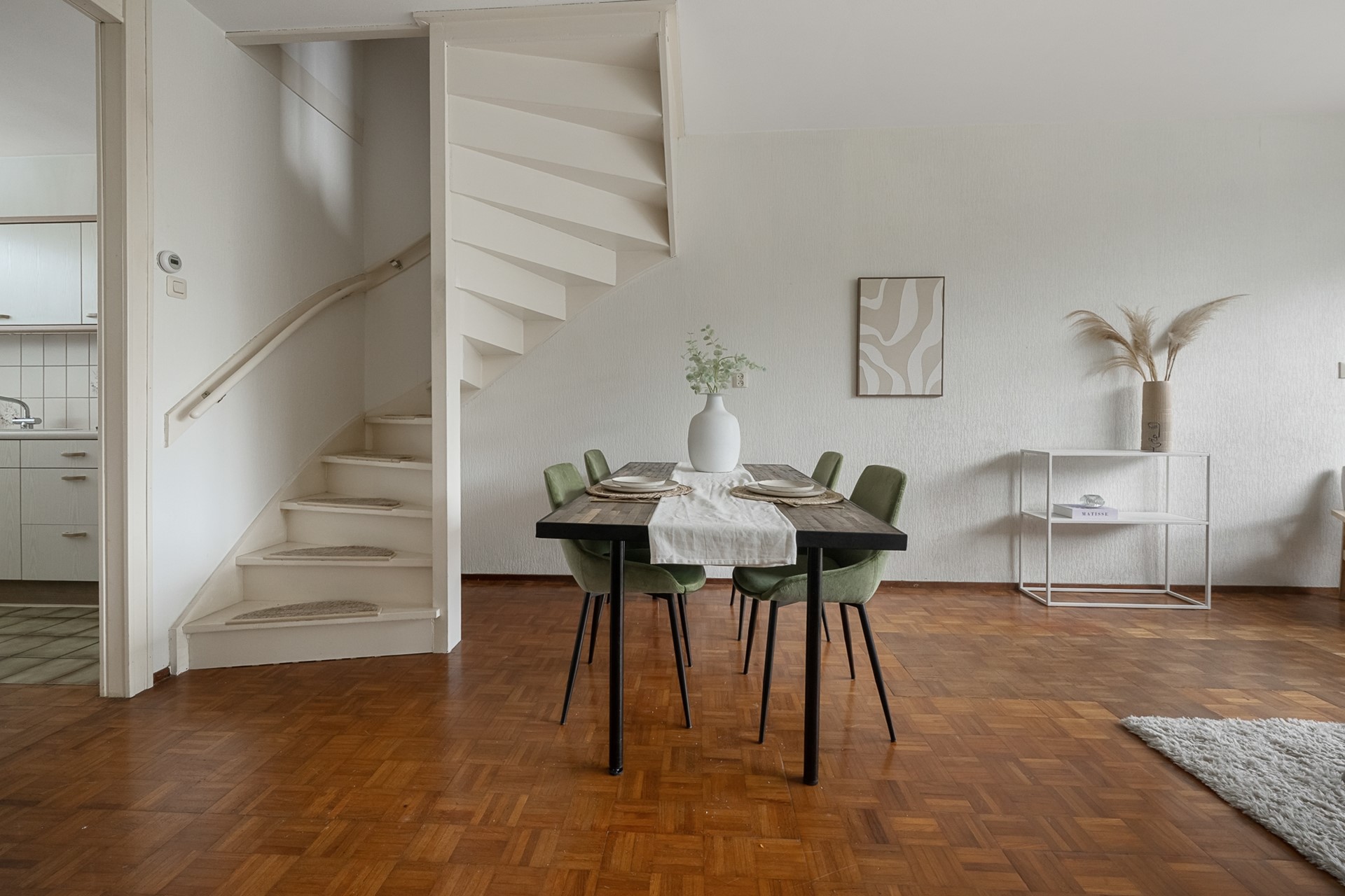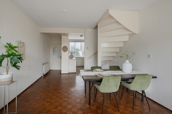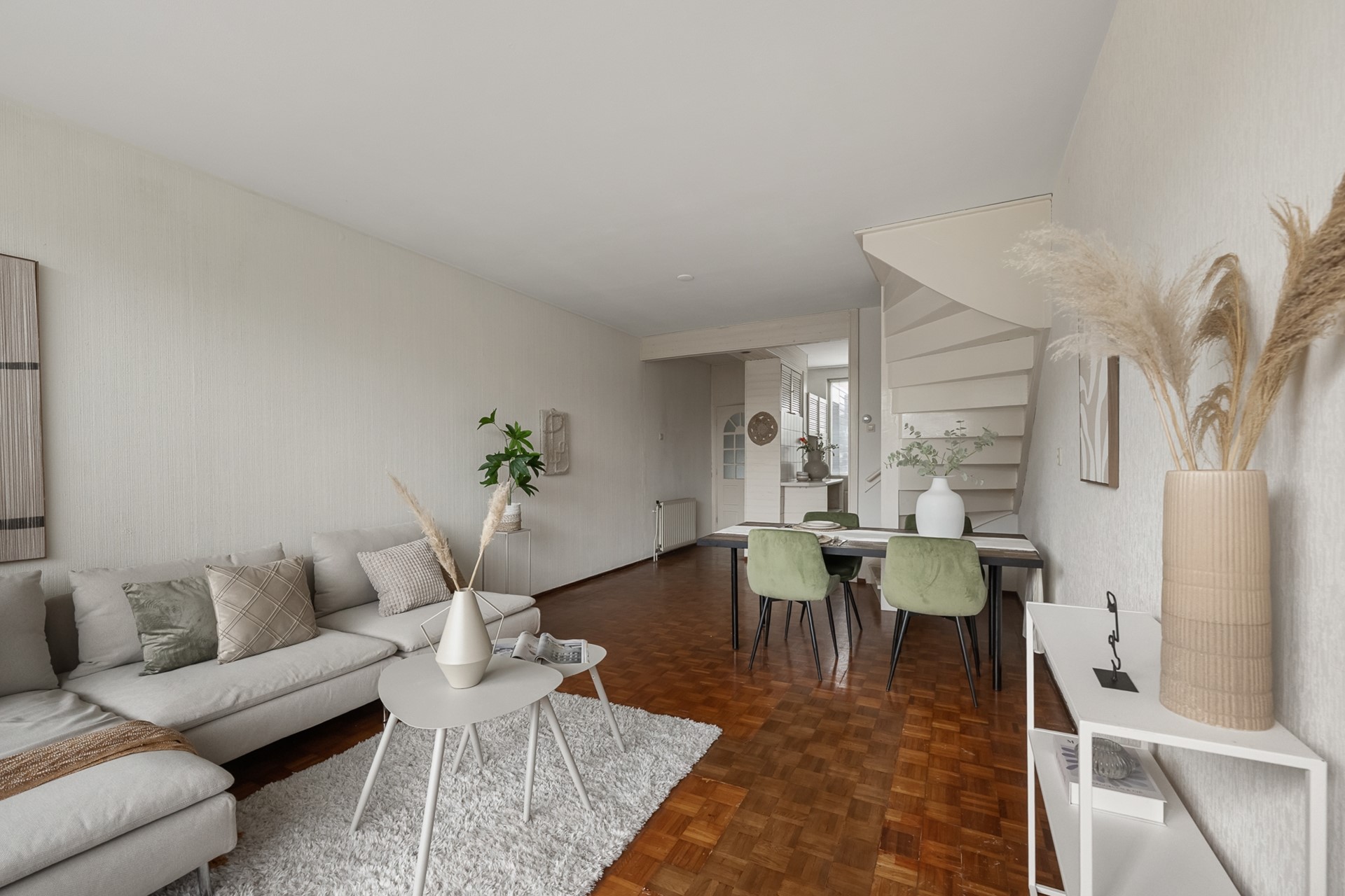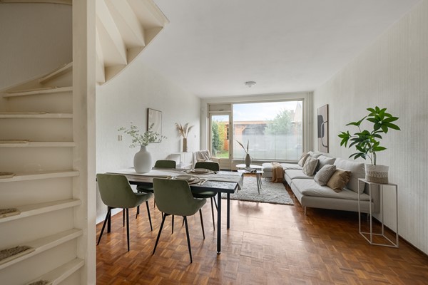 Bij binnenkomst kom je in de hal met toilet en garderobe. Vanuit daar loop je zo de lichte woonkamer in, met een mooie parketvloer en uitzicht op de tuin. De keuken vind je aan de voorkant van het huis. Vanuit de woonkamer loop je via de openslaande deur zó je tuin in.