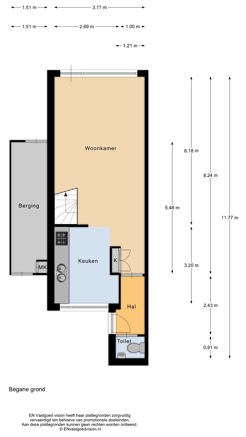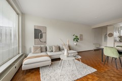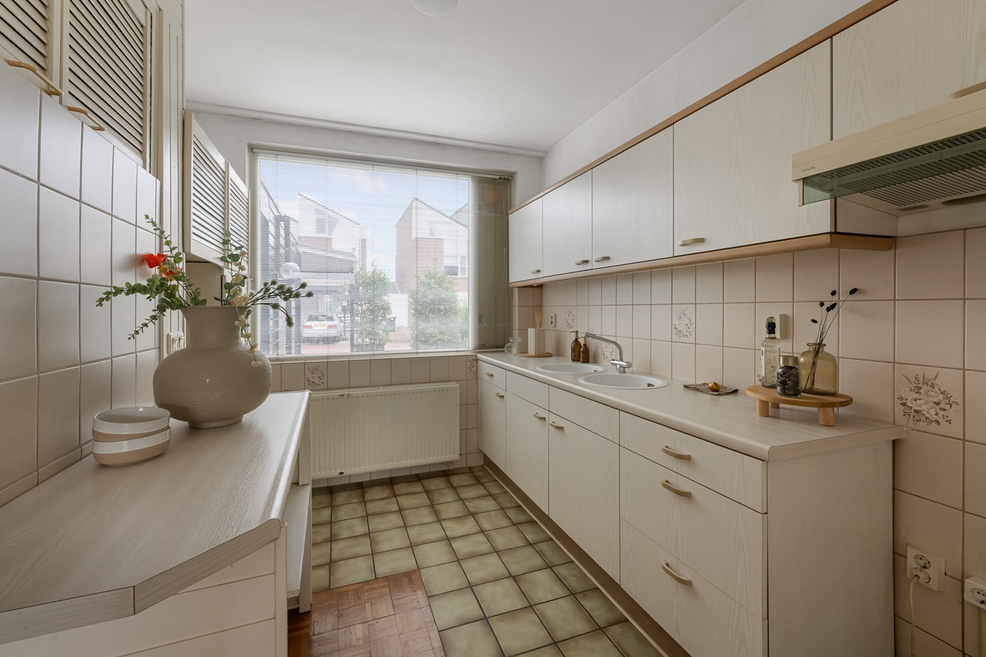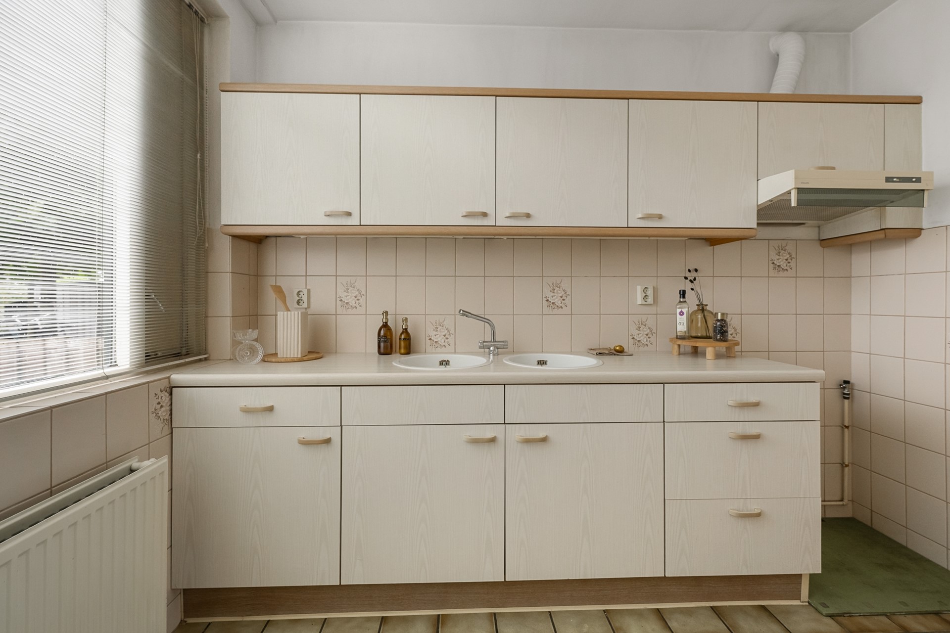Bij binnenkomst kom je in de hal met toilet en garderobe. Vanuit daar loop je zo de lichte woonkamer in, met een mooie parketvloer en uitzicht op de tuin. De keuken vind je aan de voorkant van het huis. Vanuit de woonkamer loop je via de openslaande deur zó je tuin in.