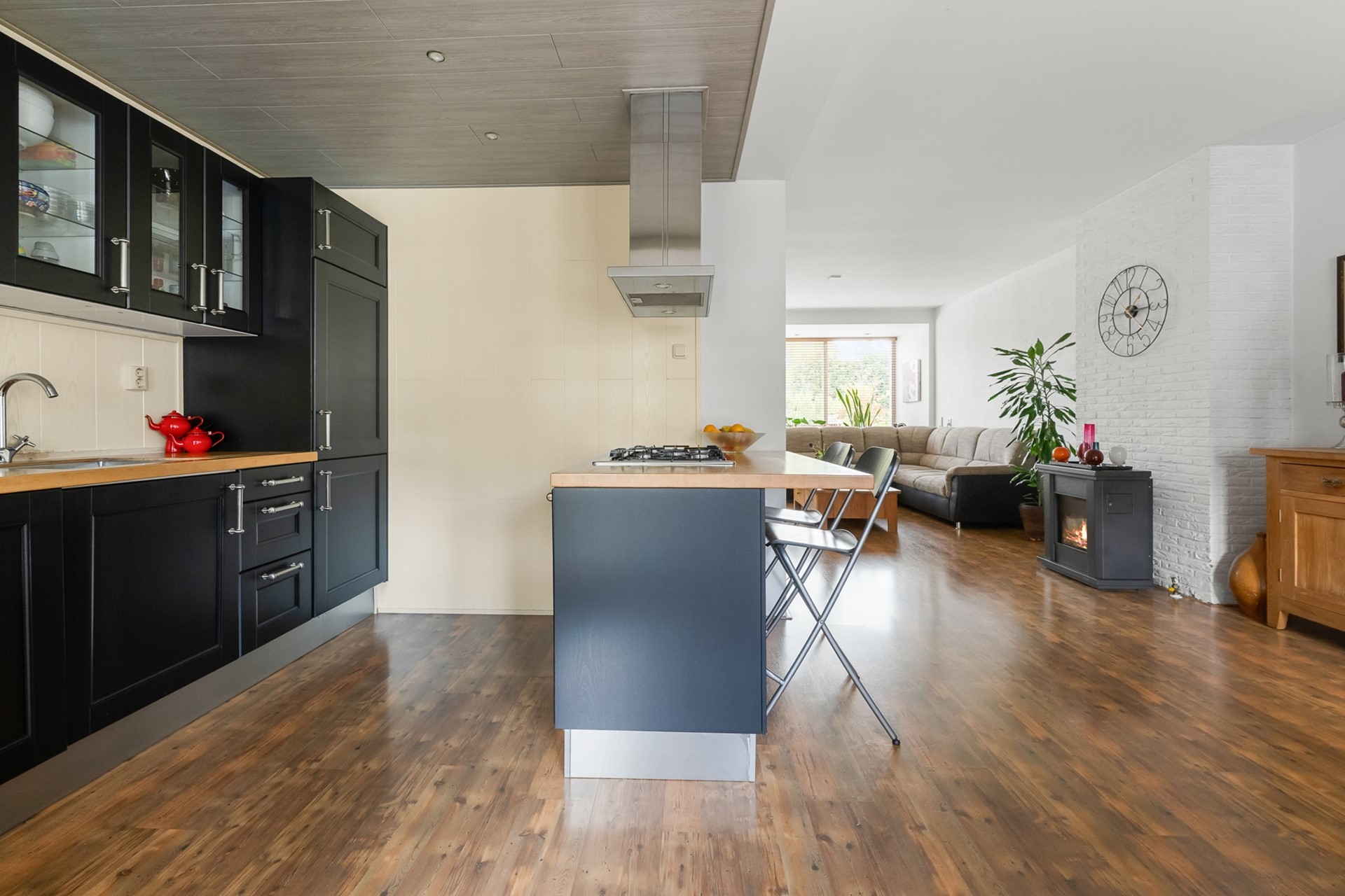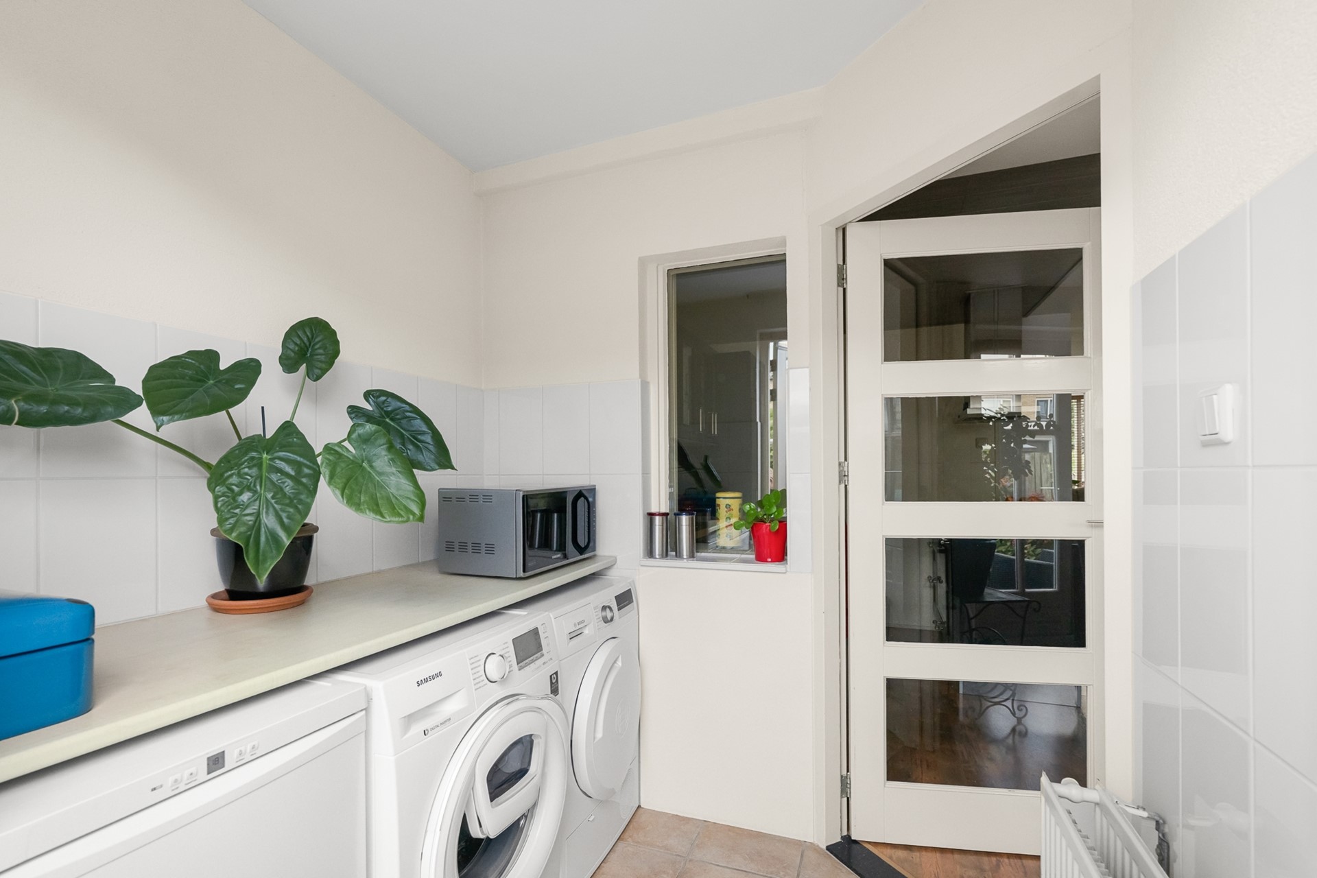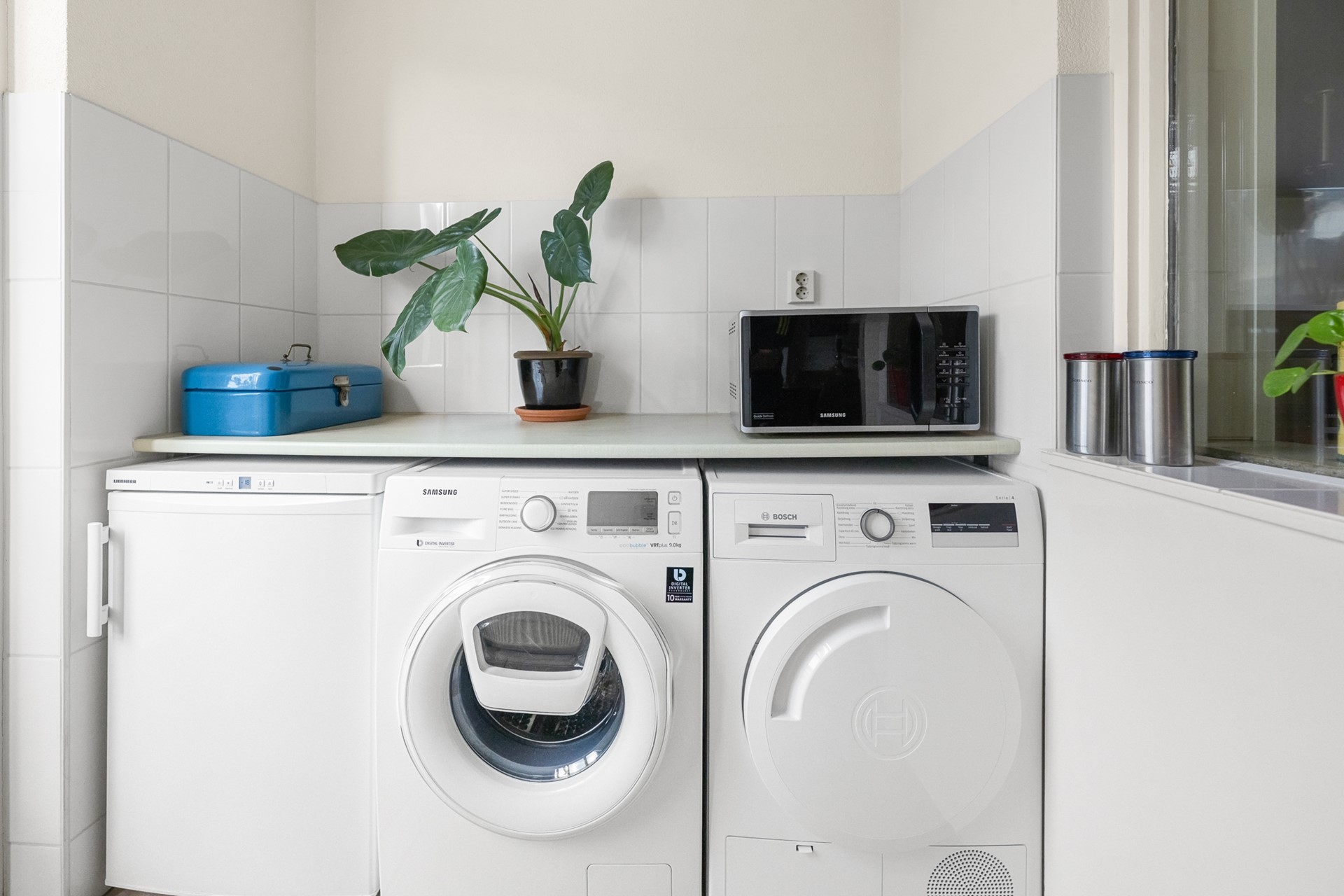 Aan de achterzijde bevindt zich de handige bijkeuken met aansluitingen voor wasmachine en droger en extra ruimte voor voorraad of apparatuur – een echte plus in het dagelijks gebruik.