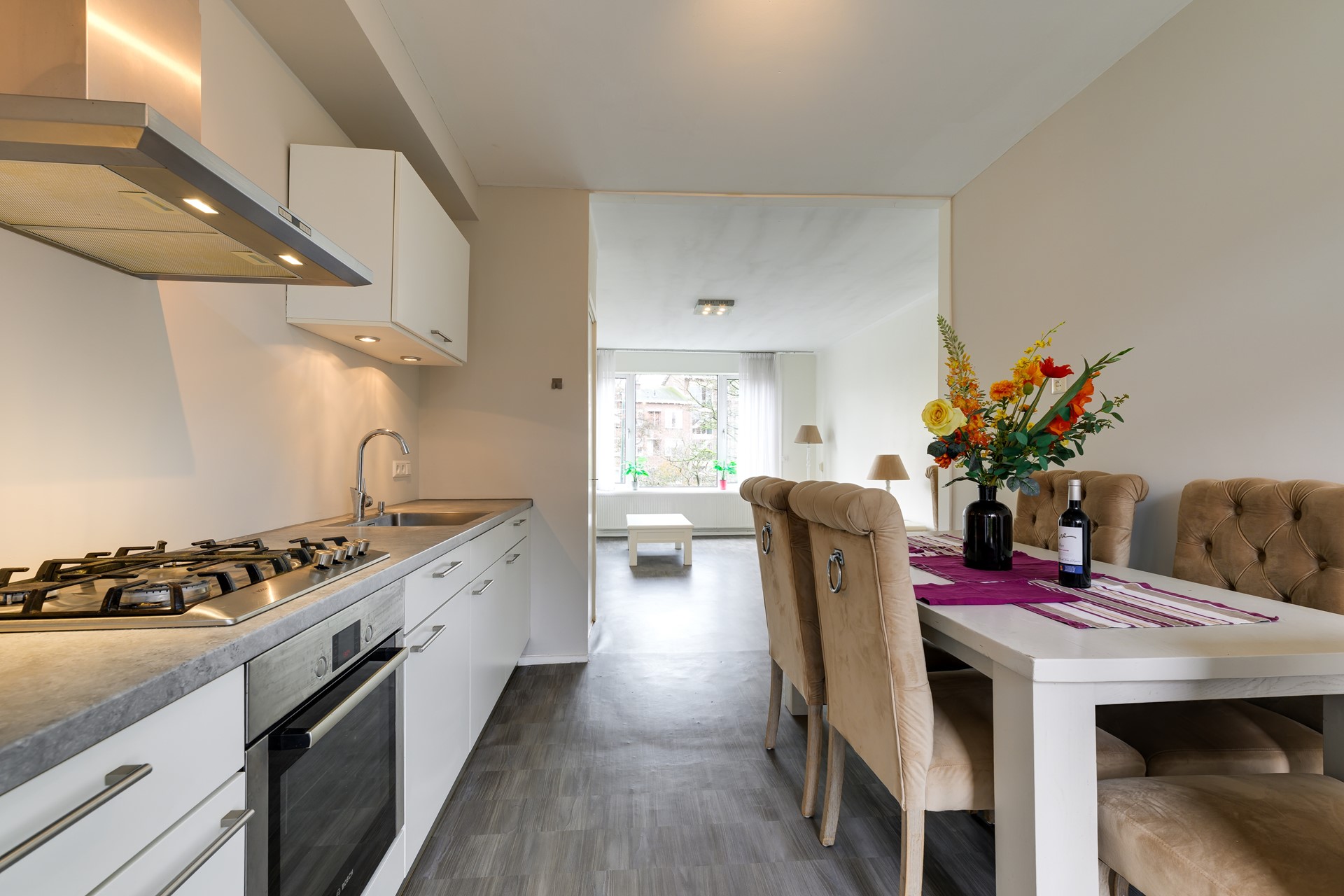 The modern kitchen connects directly to the balcony, creating a seamless indoor-outdoor feel. A perfect spot to start your morning or unwind in the evening.